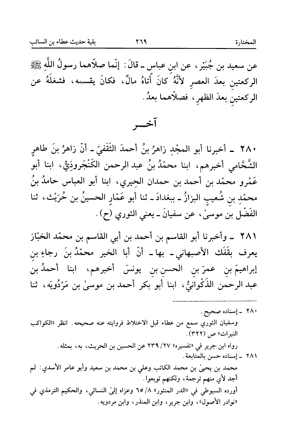 ٢٨٠ - أَخْبَرَنَا أَبُو الْمَجْدِ زَاهِرُ بْنُ أَحْمَدَ الثَّقَفِيُّ أَنَّ زَاهِرَ بْنَ طَاهِرٍ الشَّحَّامِيَّ أَخْبَرَهُمْ، أَبْنَا مُحَمَّدُ بْنُ عَبْدِ الرَّحْمَنِ الْكَنْجَرُوذِيُّ، أَبْنَا أَبُو عَمْرٍو مُحَمَّدُ بْنُ أَحْمَدَ بْنِ حَمْدَانَ الْحِيرِيُّ، أَبْنَا أَبُو الْعَبَّاسِ حَامِدُ بْنُ مُحَمَّدِ بْنِ شُعَيْبٍ الْبَزَّازُ - بِبَغْدَادَ -، ثَنَا أَبُو عَمَّارٍ الْحُسَيْنُ بْنُ حُرَيْثٍ، ثَنَا الْفَضْلُ بْنُ مُوسَى، عَنْ سُفْيَانَ يَعْنِي الثَّوْرِيَّ (ح).