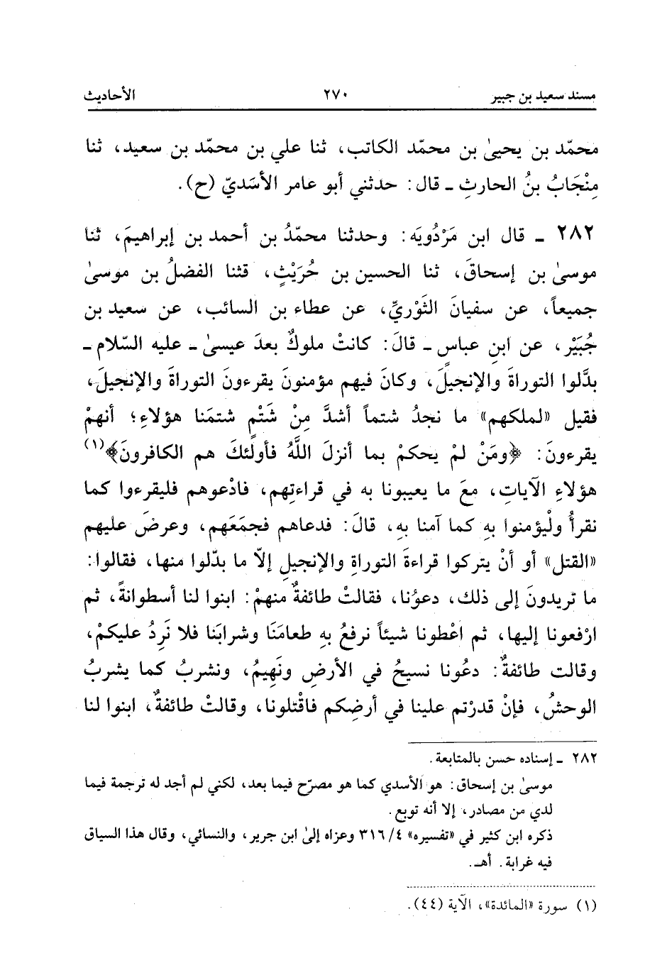 ٢٨٢ - قَالَ ابْنُ مَرْدُوَيْهِ: وَحَدَّثَنَا مُحَمَّدُ بْنُ أَحْمَدَ بْنِ إِبْرَاهِيمَ، ثَنَا مُوسَى بْنُ إِسْحَاقَ، ثَنَا الْحُسَيْنُ بْنُ حُرَيْثٍ، قَثَنَا الْفَضْلُ بْنُ مُوسَى جَمِيعًا، َنْ سُفْيَانَ الثَّوْرِيِّ، عَنْ عَطَاءِ بْنِ السَّائِبِ، عَنْ سَعِيدِ بْنِ جُبَيْرٍ، عَنِ ابْنِ عَبَّاسٍ قَالَ: «كَانَتْ مُلُوكٌ بَعْدَ عِيسَى عَلَيْهِ السَّلَامُ بَدَّلُوا التَّوْرَاةَ وَالْإِنْجِيلَ، وَكَانَ فِيهِمْ مُؤْمِنُونَ يَقْرَءُونَ التَّوْرَاةَ وَالْإِنْجِيلَ، فَقِيلَ لِمَلِكِهِمْ: مَا نَجِدُ شَتْمًا أَشَدَّ مِنْ شَتْمٍ شَتَمَنَا هَؤُلَاءِ؛ أَنَّهُمْ يَقْرَءُونَ: {وَمَنْ لَمْ يَحْكُمْ بِمَا أَنْزَلَ اللهُ فَأُولَئِكَ هُمُ الْكَافِرُونَ} هَؤُلَاءِ الْآيَاتِ مَعَ مَا يَعِيبُونَا بِهِ فِي قِرَاءَتِهِمْ، فَادْعُوهُمْ فَلْيَقْرَءُوا كَمَا نَقْرَأُ وَلْيُؤْمِنُوا بِهِ، كَمَا آمَنَّا بِهِ، قَالَ: فَدَعَاهُمْ فَجَمَعَهُمْ، وَعَرَضَ عَلَيْهِمُ الْقَتْلَ، أَوْ أَنْ يَتْرُكُوا قِرَاءَةَ التَّوْرَاةِ وَالْإِنْجِيلِ إِلَّا مَا بَدَّلُوا مِنْهَا، فَقَالُوا: مَا تُرِيدُونَ إِلَى ذَلِكَ دَعُونَا، فَقَالَتْ طَائِفَةٌ مِنْهُمْ: ابْنُوا لَنَا أُسْطُوَانَةً، ثُمَّ ارْفَعُونَا إِلَيْهَا، ثُمَّ أَعْطُونَا شَيْئًا نَرْفَعُ بِهِ طَعَامَنَا وَشَرَابَنَا فَلَا نَرِدُ عَلَيْكُمْ، وَقَالَتْ طَائِفَةٌ: دَعُونَا نَسِيحُ فِي الْأَرْضِ وَنَهِيمُ، وَنَشْرَبُ كَمَا يَشْرَبُ الْوَحْشُ؛ فَإِنْ قَدَرْتُمْ عَلَيْنَا فِي أَرْضِكُمْ فَاقْتُلُونَا، وَقَالَتْ طَائِفَةٌ: ابْنُوا لَنَا