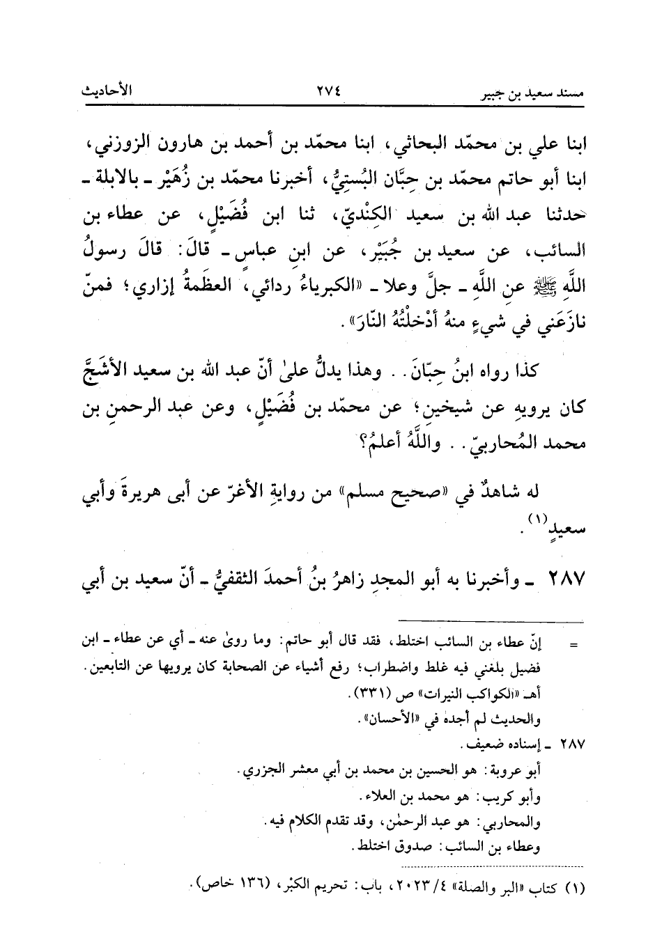 الرَّجَاءِ الصَّيْرَفِيَّ أَخْبَرَهُمْ، أَبْنَا أَحْمَدُ بْنُ مَحْمُودِ بْنِ أَحْمَدَ الثَّقَفِيُّ، أَبْنَا مُحَمَّدُ بْنُ إِبْرَاهِيمَ بْنِ الْمُقْرِئِ، ثَنَا أَبُو عَرُوبَةَ، ثَنَا أَبُو كُرَيْبٍ، ثَنَا الْمُحَارِبِيُّ، عَنْ عَطَاءِ بْنِ السَّائِبِ، عَنْ سَعِيدِ بْنِ جُبَيْرٍ، عَنِ ابْنِ عَبَّاسٍ، قَالَ: قَالَ النَّبِيُّ صَلَّى اللهُ عَلَيْهِ وَسَلَّمَ: «يَقُولُ اللهُ عَزَّ وَجَلَّ: الْكِبْرِيَاءُ رِدَائِي، الْعَظَمَةُ إِزَارِي فَمَنْ نَازَعَنِي فِيهِمَا أَلْقَيْتُهُ النَّارَ».