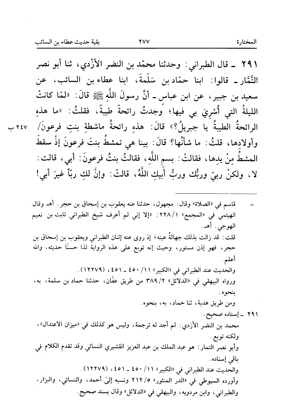 ٢٩١ - قَالَ الطَّبَرَانِيُّ: وَحَدَّثَنَا مُحَمَّدُ بْنُ النَّضِرِ الْأَزْدِيُّ، ثَنَا أَبُو نَصْرٍ التَّمَّارُ قَالُوا: أَبْنَا حَمَّادُ بْنُ سَلَمَةَ، أَبْنَا عَطَاءُ بْنُ السَّائِبِ، عَنْ سَعِيدِ بْنِ جُبَيْرٍ، عَنِ ابْنِ عَبَّاسٍ أَنَّ رَسُولَ اللهِ صَلَّى اللهُ عَلَيْهِ وَسَلَّمَ قَالَ: «لَمَّا كَانَتِ اللَّيْلَةُ الَّتِي أُسْرِيَ بِي فِيهَا وَجَدْتُ رَائِحَةً طَيِّبَةً، فَقُلْتُ: مَا هَذِهِ الرَّائِحَةُ الطَّيِّبَةُ يَا جِبْرِيلُ؟ قَالَ: هَذِهِ رَائِحَةُ مَاشِطَةِ بِنْتِ فِرْعَوْنَ وَأَوْلَادِهَا، قُلْتُ: مَا شَأْنُهَا؟ قَالَ: بَيْنَا هِيَ تَمْشُطُ بِنْتَ فِرْعَوْنَ؛ إِذْ سَقَطَ الْمُشْطُ مِنْ يَدِهَا فَقَالَتْ: بِاسْمِ اللهِ، فَقَالَتْ بِنْتُ فِرْعَوْنَ: أَبِي؟ قَالَتْ: لَا، وَلَكِنَّ رَبِّي وَرَبَّكِ وَرَبَّ أَبِيكِ اللهُ، قَالَتْ: وَإِنَّ لَكِ رَبًّا غَيْرَ أَبِي!