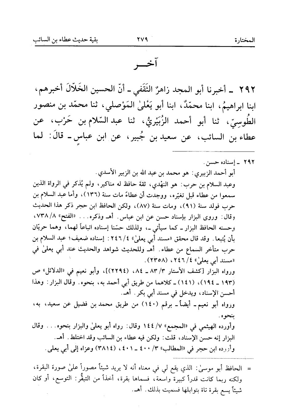 ٢٩٢ - أَخْبَرَنَا أَبُو الْمَجْدِ زَاهِرٌ الثَّقَفِيُّ، أَنَّ الْحُسَيْنَ الْخَلَّالَ أَخْبَرَهُمْ، أَبْنَا إِبْرَاهِيمُ، أَبْنَا مُحَمَّدٌ، أَبْنَا أَبُو يَعْلَى الْمَوْصِلِيُّ، ثَنَا مُحَمَّدُ بْنُ مَنْصُورٍ الطُّوسِيُّ، ثَنَا أَبُو أَحْمَدَ الزُّبَيْرِيُّ، ثَنَا عَبْدُ السَّلَامِ بْنُ حَرْبٍ، عَنْ عَطَاءِ بْنِ السَّائِبِ، عَنْ سَعِيدِ بْنِ جُبَيْرٍ، عَنِ ابْنِ عَبَّاسٍ قَالَ: «لَمَّا