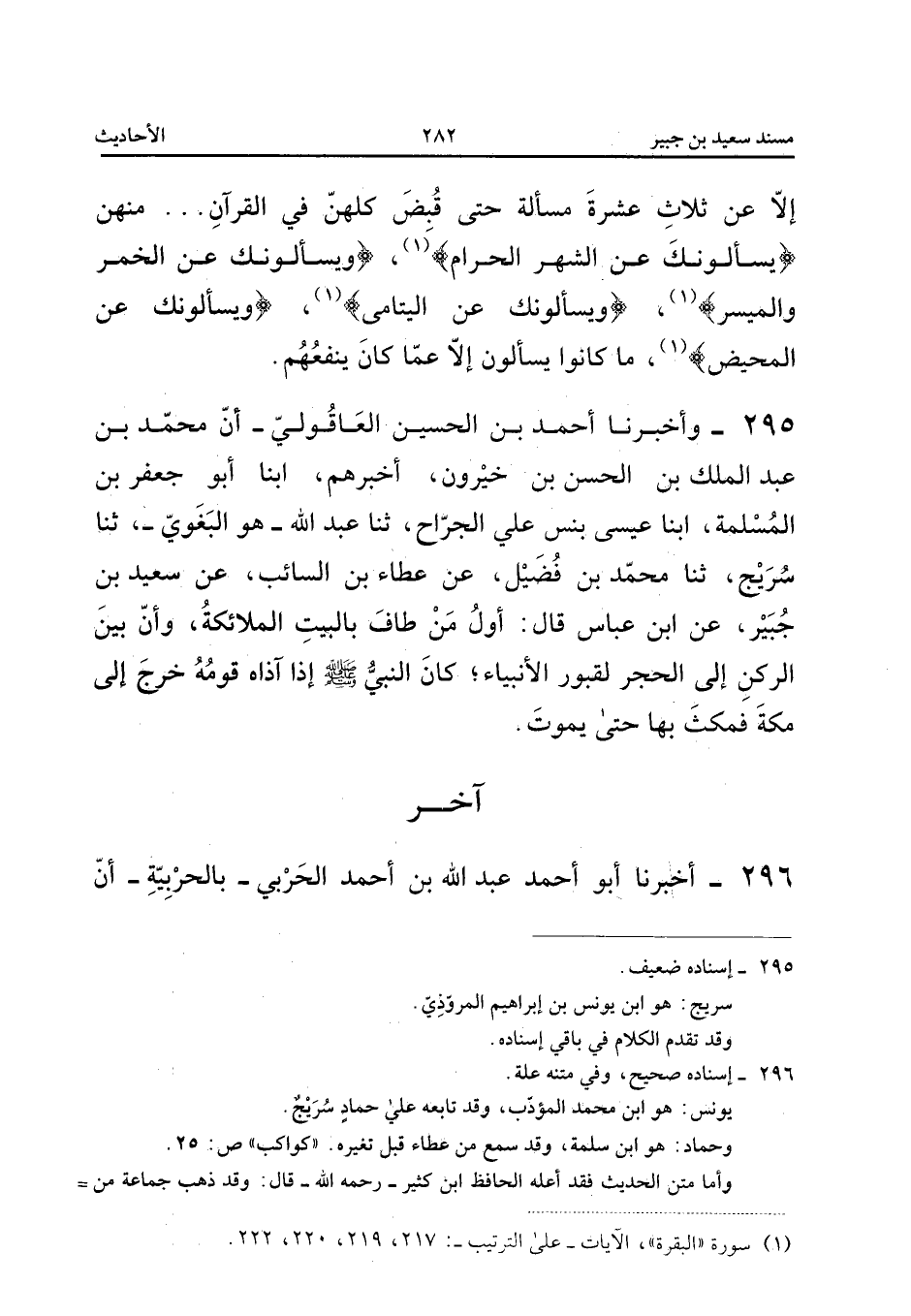 ٢٩٥ - وَأَخْبَرَنَا أَحْمَدُ بْنُ الْحُسَيْنِ الْعَاقُولِيُّ، أَنَّ مُحَمَّدَ بْنَ عَبْدِ الْمَلِكِ بْنِ الْحَسَنِ بْنِ خَيْرُونَ أَخْبَرَهُمْ، أَبْنَا أَبُو جَعْفَرِ بْنُ الْمُسْلِمَةِ، أَبْنَا عِيسَى بْنُ عَلِيٍّ الْجَرَّاحُ، ثَنَا عَبْدُ اللهِ - هُوَ الْبَغَوِيُّ - ثَنَا سُرَيْجٌ، ثَنَا مُحَمَّدُ بْنُ فُضَيْلٍ، عَنْ عَطَاءِ بْنِ السَّائِبِ، عَنْ سَعِيدِ بْنِ جُبَيْرٍ، عَنِ ابْنِ عَبَّاسٍ قَالَ: «أَوَّلُ مَنْ طَافَ بِالْبَيْتِ الْمَلَائِكَةُ، وَأَنَّ بَيْنَ الرُّكْنِ إِلَى الْحَجَرِ لَقُبُورَ الْأَنْبِيَاءِ كَانَ النَّبِيُّ صَلَّى اللهُ عَلَيْهِ وَسَلَّمَ إِذَا آذَاهُ قَوْمُهُ خَرَجَ إِلَى مَكَّةَ فَمَكَثَ بِهَا حَتَّى يَمُوتَ».