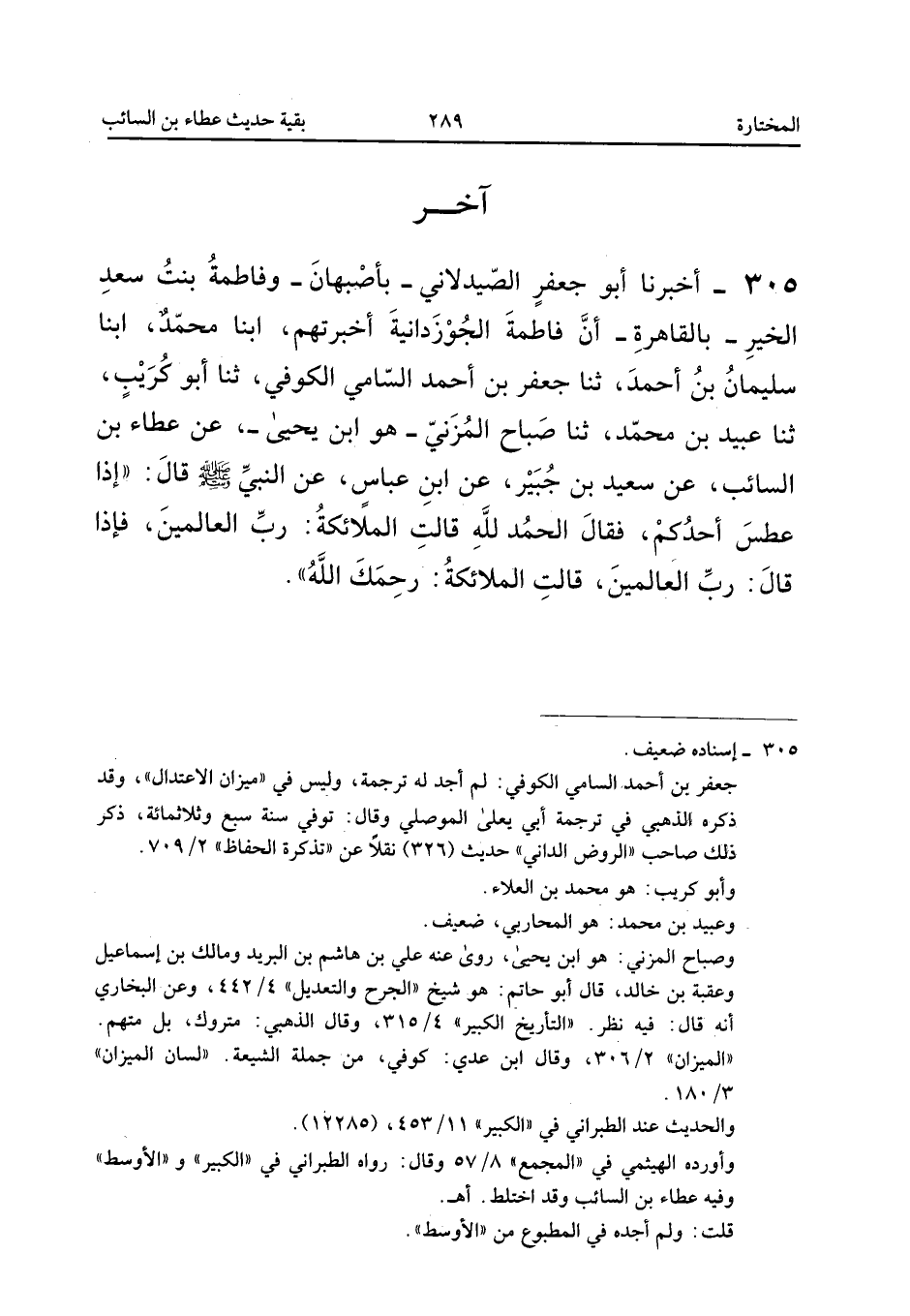 ٣٠٥ - أَخْبَرَنَا أَبُو جَعْفَرٍ الصَّيْدَلَانِيُّ - بِأَصْبَهَانَ - وَفَاطِمَةُ بِنْتُ سَعْدِ الْخَيْرِ بِالْقَاهِرَةِ أَنَّ فَاطِمَةَ الْجُوزْدَانِيَّةَ أَخْبَرَتْهُمْ، أَبْنَا مُحَمَّدٌ، أَبْنَا سُلَيْمَانُ بْنُ أَحْمَدَ، ثَنَا جَعْفَرُ بْنُ أَحْمَدَ السَّامِيُّ الْكُوفِيُّ، ثَنَا أَبُو كُرَيْبٍ، ثَنَا عُبَيْدُ بْنُ مُحَمَّدٍ، ثَنَا صَبَّاحٌ الْمُزَنِيُّ - هُوَ ابْنُ يَحْيَى - عَنْ عَطَاءِ بْنِ السَّائِبِ، عَنْ سَعِيدِ بْنِ جُبَيْرٍ، عَنِ ابْنِ عَبَّاسٍ، عَنِ النَّبِيِّ صَلَّى اللهُ عَلَيْهِ وَسَلَّمَ قَالَ: «إِذَا عَطَسَ أَحَدُكُمْ، فَقَالَ: الْحَمْدُ لِلهِ قَالَتِ الْمَلَائِكَةُ: رَبِّ الْعَالَمِينَ، فَإِذَا قَالَ: رَبِّ الْعَالَمِينَ، قَالَتِ الْمَلَائِكَةُ: رَحِمَكَ اللهُ».