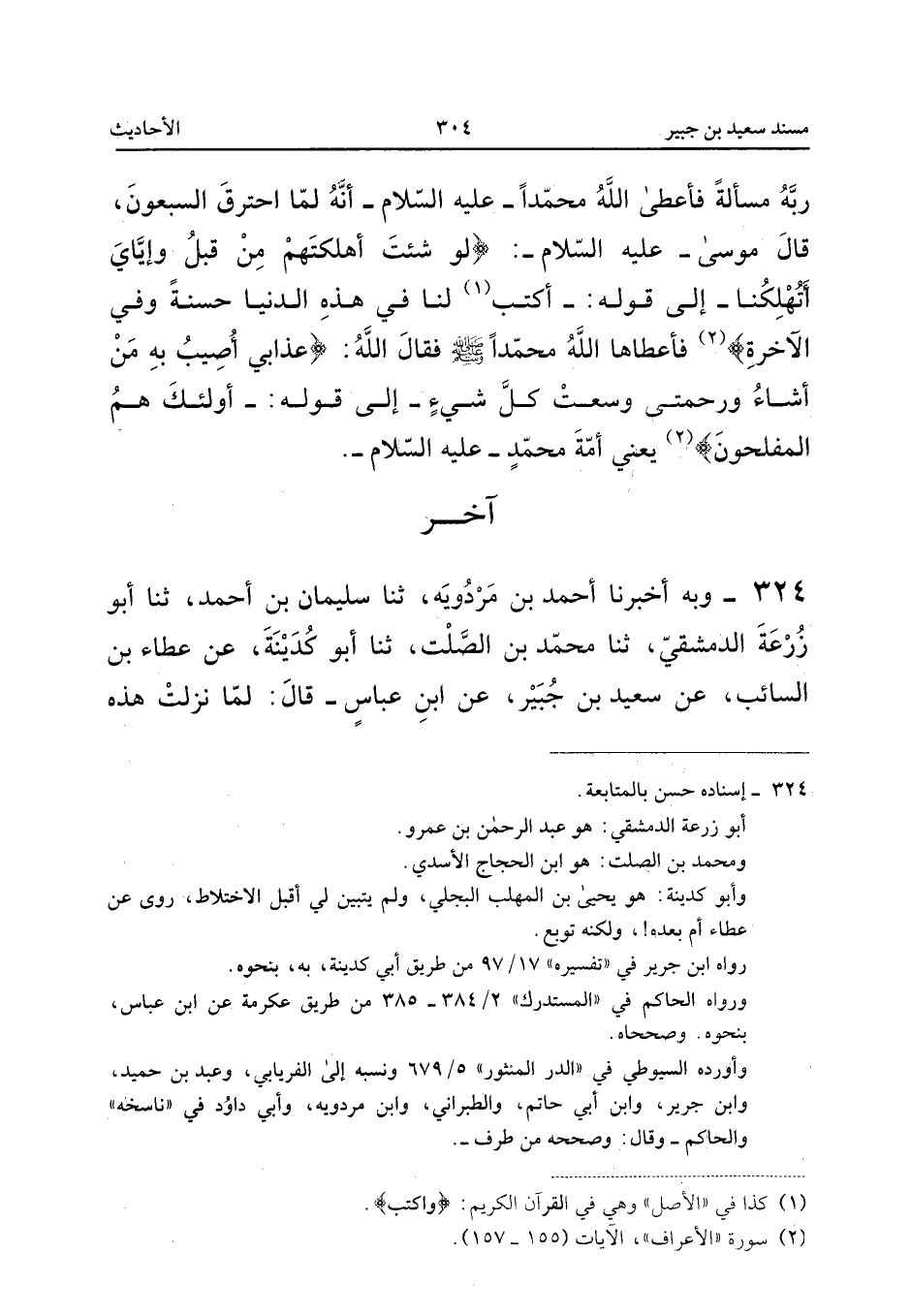 ٣٢٤ - وَبِهِ أَخْبَرَنَا أَحْمَدُ بْنُ مَرْدُوَيْهِ، ثَنَا سُلَيْمَانُ بْنُ أَحْمَدَ، ثَنَا أَبُو زُرْعَةَ الدِّمَشْقِيُّ، ثَنَا مُحَمَّدُ بْنُ الصَّلْتِ، ثَنَا أَبُو كُدَيْنَةَ، عَنْ عَطَاءِ بْنِ السَّائِبِ، عَنْ سَعِيدِ بْنِ جُبَيْرٍ، عَنِ ابْنِ عَبَّاسٍ قَالَ: «لَمَّا نَزَلَتْ هَذِهِ