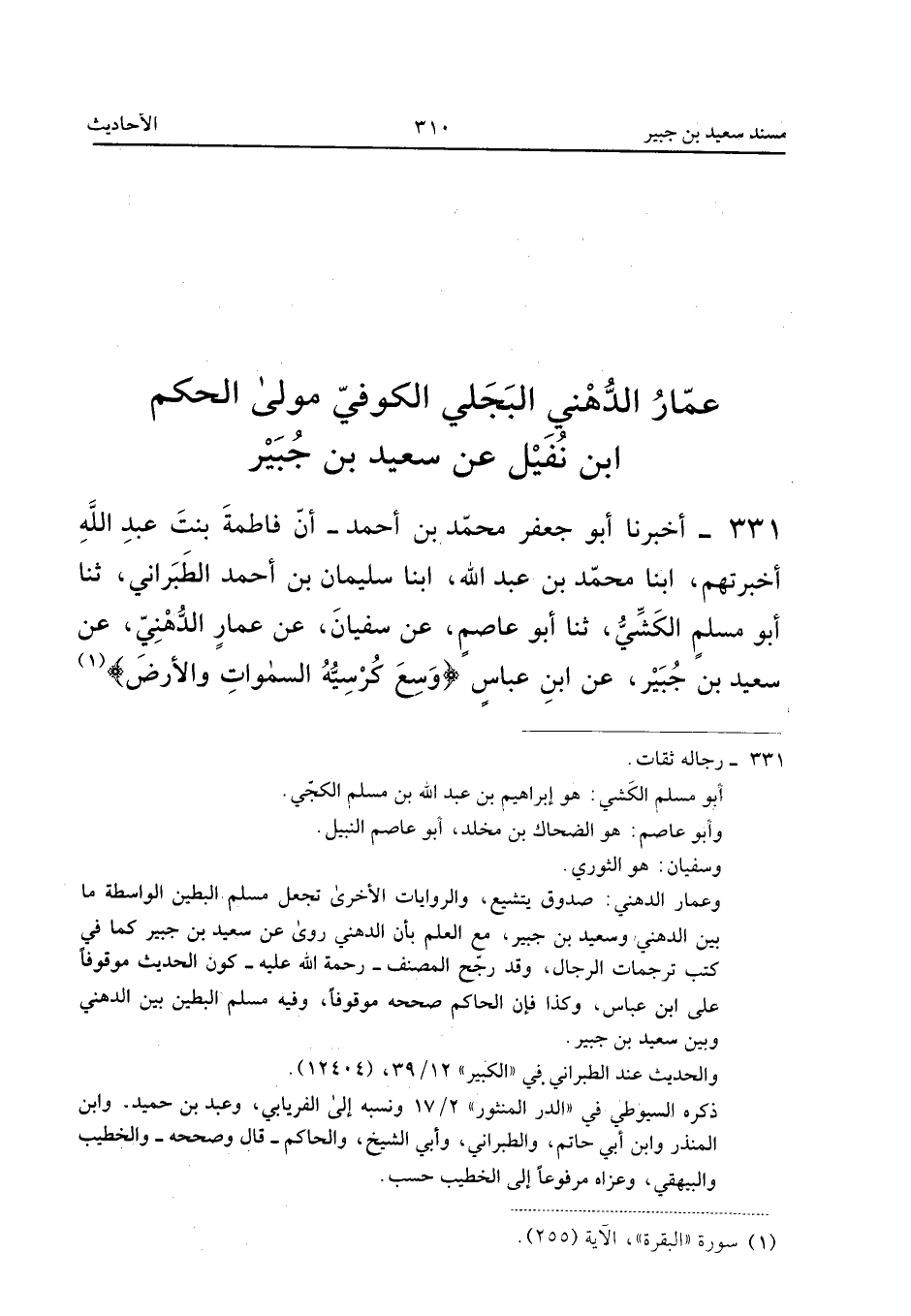 ٣٣١ - أَخْبَرَنَا أَبُو جَعْفَرٍ مُحَمَّدُ بْنُ أَحْمَدَ أَنَّ فَاطِمَةَ بِنْتَ عَبْدِ اللهِ أَخْبَرَتْهُمْ، أَبْنَا مُحَمَّدُ بْنُ عَبْدِ اللهِ، أَبْنَا سُلَيْمَانُ بْنُ أَحْمَدَ الطَّبَرَانِيُّ، ثَنَا أَبُو مُسْلِمٍ الْكَشِّيُّ، ثَنَا أَبُو عَاصِمٍ، عَنْ سُفْيَانَ، عَنْ عَمَّارٍ الدُّهْنِيِّ، عَنْ سَعِيدِ بْنِ جُبَيْرٍ، عَنِ ابْنِ عَبَّاسٍ: «{وَسِعَ كُرْسِيُّهُ السَّمَاوَاتِ وَالأَرْضَ}