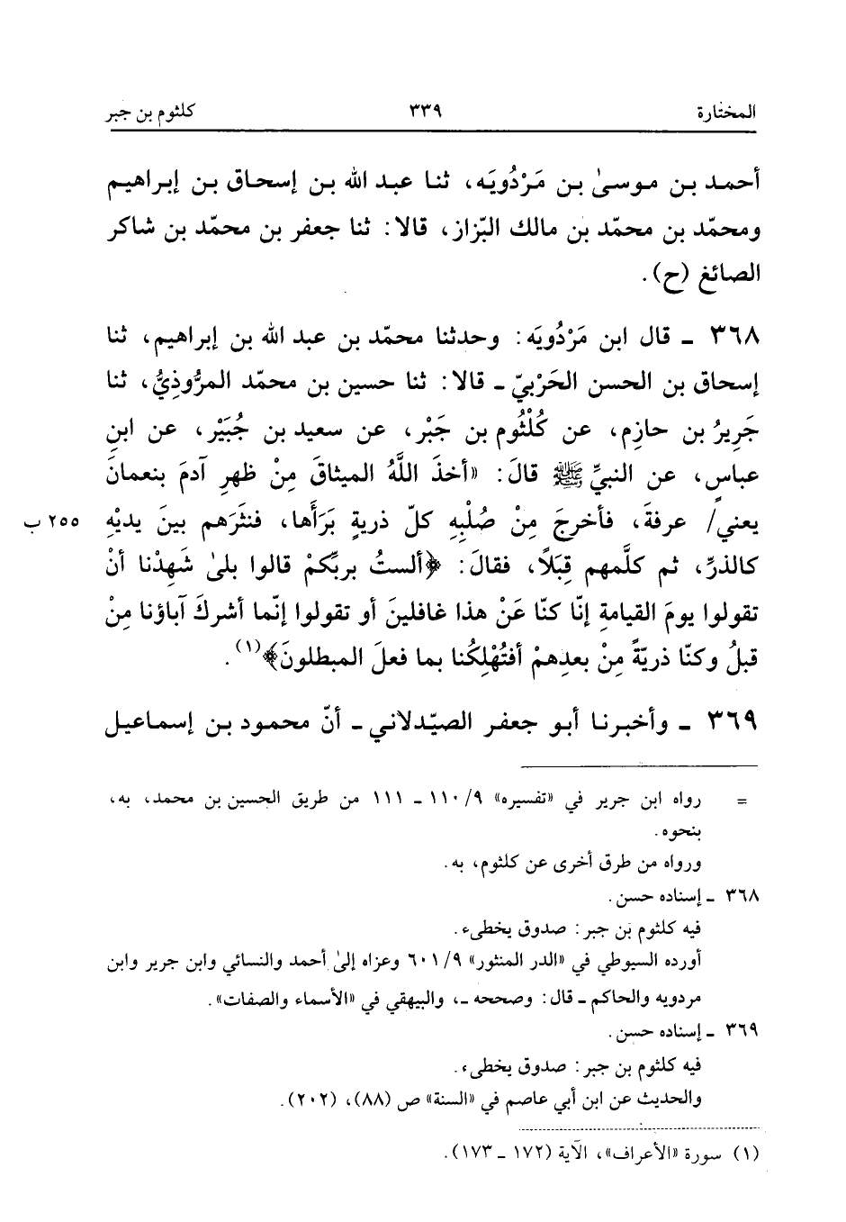 ٣٦٨ - قَالَ ابْنُ مَرْدُوَيْهِ: وَحَدَّثَنَا مُحَمَّدُ بْنُ عَبْدِ اللهِ بْنِ إِبْرَاهِيمَ، ثَنَا إِسْحَاقُ بْنُ الْحَسَنِ الْحَرْبِيُّ قَالَا: ثَنَا حُسَيْنُ بْنُ مُحَمَّدٍ الْمَرُّوذِيُّ، ثَنَا جَرِيرُ بْنُ حَازِمٍ، عَنْ كُلْثُومِ بْنِ جَبْرٍ، عَنْ سَعِيدِ بْنِ جُبَيْرٍ، عَنِ ابْنِ عَبَّاسٍ، عَنِ النَّبِيِّ صَلَّى اللهُ عَلَيْهِ وَسَلَّمَ قَالَ: «أَخَذَ اللهُ الْمِيثَاقَ مِنْ ظَهْرِ آدَمَ بِنَعْمَانَ - يَعْنِي عَرَفَةَ - فَأَخْرَجَ مِنْ صُلْبِهِ كُلَّ ذُرِّيَّةٍ بَرَأَهَا، فَنَثَرَهُمْ بَيْنَ يَدَيْهِ كَالذَّرِّ، ثُمَّ كَلَّمَهُمْ قِبَلًا، فَقَالَ: {أَلَسْتُ بِرَبِّكُمْ قَالُوا بَلَى شَهِدْنَا أَنْ تَقُولُوا يَوْمَ الْقِيَامَةِ إِنَّا كُنَّا عَنْ هَذَا غَافِلِينَ * أَوْ تَقُولُوا إِنَّمَا أَشْرَكَ آبَاؤُنَا مِنْ قَبْلُ وَكُنَّا ذُرِّيَّةً مِنْ بَعْدِهِمْ أَفَتُهْلِكُنَا بِمَا فَعَلَ الْمُبْطِلُونَ}».