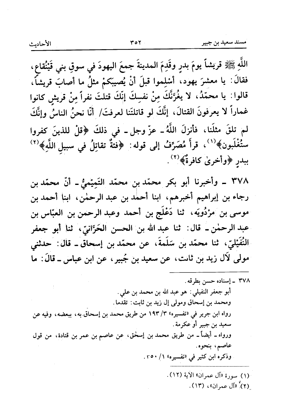 ٣٧٨ - وَأَخْبَرَنَا أَبُو بَكْرٍ مُحَمَّدُ بْنُ مُحَمَّدٍ التَّمِيمِيُّ أَنَّ مُحَمَّدَ بْنَ رَجَاءِ بْنِ إِبْرَاهِيمَ أَخْبَرَهُمْ، أَبْنَا أَحْمَدُ بْنُ عَبْدِ الرَّحْمَنِ، أَبْنَا أَحْمَدُ بْنُ مُوسَى بْنِ مَرْدُوَيْهِ، ثَنَا دَعْلَجُ بْنُ أَحْمَدَ وَعَبْدُ الرَّحْمَنِ بْنُ الْعَبَّاسِ بْنِ عَبْدِ الرَّحْمَنِ قَالَ: ثَنَا عَبْدُ اللهِ بْنُ الْحَسَنِ الْحَرَّانِيُّ، ثَنَا أَبُو جَعْفَرٍ النُّفَيْلِيُّ، ثَنَا مُحَمَّدُ بْنُ سَلَمَةَ، عَنْ مُحَمَّدِ بْنِ إِسْحَاقَ قَالَ: حَدَّثَنِي مَوْلًى لِآلِ زَيْدِ بْنِ ثَابِتٍ، عَنْ سَعِيدِ بْنِ جُبَيْرٍ، عَنِ ابْنِ عَبَّاسٍ قَالَ: «مَا