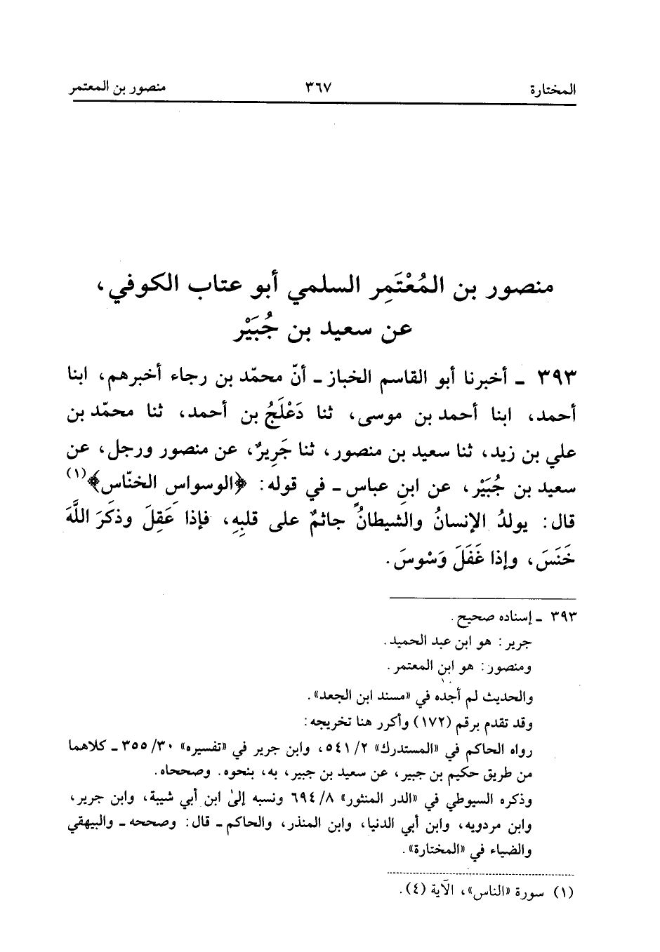 ٣٩٣ - أَخْبَرَنَا أَبُو الْقَاسِمِ الْخَبَّازُ، أَنَّ مُحَمَّدَ بْنَ رَجَاءٍ أَخْبَرَهُمْ، أَبْنَا أَحْمَدُ، أَبْنَا أَحْمَدُ بْنُ مُوسَى، ثَنَا دَعْلَجُ بْنُ أَحْمَدَ، ثَنَا مُحَمَّدُ بْنُ عَلِيِّ بْنِ زَيْدٍ، ثَنَا سَعِيدُ بْنُ مَنْصُورٍ، ثَنَا جَرِيرٌ، عَنْ مَنْصُورٍ وَرَجُلٍ، عَنْ سَعِيدِ بْنِ جُبَيْرٍ، عَنِ ابْنِ عَبَّاسٍ «فِي قَوْلِهِ: {الْوَسْوَاسِ الْخَنَّاسِ} قَالَ يُولَدُ الْإِنْسَانُ وَالشَّيْطَانُ جَاثِمٌ عَلَى قَلْبِهِ، فَإِذَا عَقَلَ وَذَكَرَ اللهَ خَنَسَ وَإِذَا غَفَلَ وَسْوَسَ».