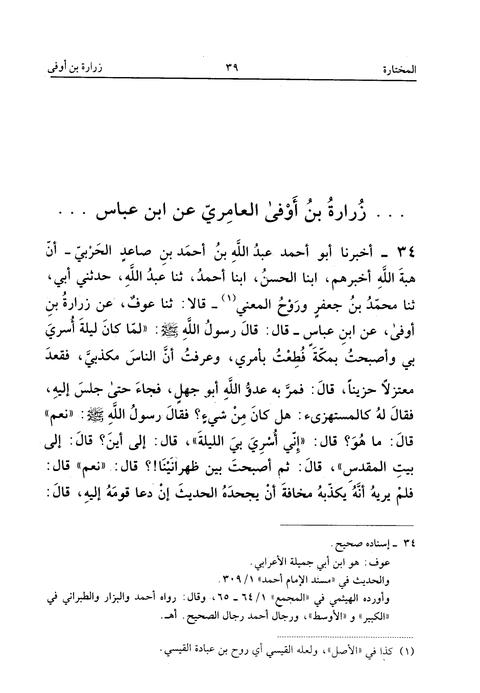 ٣٤ - أَخْبَرَنَا أَبُو أَحْمَدَ عَبْدُ اللهِ بْنُ أَحْمَدَ بْنِ صَاعِدٍ الْحَرْبِيُّ أَنَّ هِبَةَ اللهِ أَخْبَرَهُمْ، أَبْنَا الْحَسَنُ، أَبْنَا أَحْمَدُ، ثَنَا عَبْدُ اللهِ، حَدَّثَنِي أَبِي، ثَنَا مُحَمَّدُ بْنُ جَعْفَرٍ وَرَوْحٌ الْمَعْنِيُّ قَالَا: ثَنَا عَوْفٌ، عَنْ زُرَارَةَ بْنِ أَوْفَى، عَنِ ابْنِ عَبَّاسٍ، قَالَ: قَالَ رَسُولُ اللهِ صَلَّى اللهُ عَلَيْهِ وَسَلَّمَ «: لَمَّا كَانَ لَيْلَةَ أُسْرِيَ بِي وَأَصْبَحْتُ بِمَكَّةَ فَظِعْتُ بِأَمْرِي، وَعَرَفْتُ أَنَّ النَّاسَ مُكَذِّبِيَّ، فَقَعَدَ مُعْتَزِلًا حَزِينًا، قَالَ: فَمَرَّ بِهِ عَدُوُّ اللهِ أَبُو جَهْلٍ، فَجَاءَ حَتَّى جَلَسَ إِلَيْهِ، فَقَالَ لَهُ كَالْمُسْتَهْزِئِ: هَلْ كَانَ مِنْ شَيْءٍ؟ فَقَالَ رَسُولُ اللهِ صَلَّى اللهُ عَلَيْهِ وَسَلَّمَ: نَعَمْ قَالَ: مَا هُوَ؟ قَالَ: إِنِّي أُسْرِيَ بِي اللَّيْلَةَ قَالَ: إِلَى أَيْنَ؟ قَالَ: إِلَى بَيْتِ الْمَقْدِسِ، قَالَ: ثُمَّ أَصْبَحْتَ بَيْنَ ظَهْرَانَيْنَا؟ ! قَالَ: نَعَمْ قَالَ: فَلَمْ يُرِيهِ أَنَّهُ يُكَذِّبُهُ؛ مَخَافَةَ أَنْ يَجْحَدَهُ الْحَدِيثَ إِنْ دَعَا قَوْمَهُ إِلَيْهِ، قَالَ: