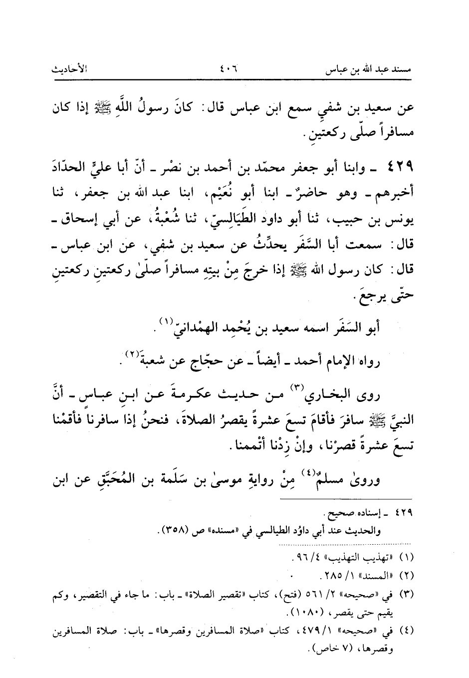 ٤٢٩ - وَأَبْنَا أَبُو جَعْفَرٍ مُحَمَّدُ بْنُ أَحْمَدَ بْنِ نَصْرٍ، أَنَّ أَبَا عَلِيٍّ الْحَدَّادَ أَخْبَرَهُمْ وَهُوَ حَاضِرٌ، أَبْنَا أَبُو نُعَيْمٍ، أَبْنَا عَبْدُ اللهِ بْنُ جَعْفَرٍ، ثَنَا يُونُسُ بْنُ حَبِيبٍ، ثَنَا أَبُو دَاوُدَ الطَّيَالِسِيُّ، ثَنَا شُعْبَةُ، عَنْ أَبِي إِسْحَاقَ، قَالَ: سَمِعْتُ أَبَا السَّفَرِ يُحَدِّثُ عَنْ سَعِيدِ بْنِ شَفِيٍّ، عَنِ ابْنِ عَبَّاسٍ قَالَ: «كَانَ رَسُولُ اللهِ صَلَّى اللهُ عَلَيْهِ وَسَلَّمَ إِذَا خَرَجَ مِنْ بَيْتِهِ مُسَافِرًا صَلَّى رَكْعَتَيْنِ رَكْعَتَيْنِ حَتَّى يَرْجِعَ».