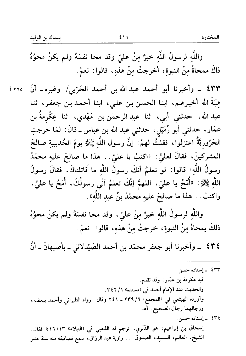 ٤٣٣ - وَأَخْبَرَنَا أَبُو أَحْمَدَ عَبْدُ اللهِ بْنُ أَحْمَدَ الْحَرْبِيُّ (¬١)، وَغَيْرُهُ، أَنَّ هِبَةَ اللهِ أَخْبَرَهُمْ، أَبْنَا الْحَسَنُ بْنُ عَلِيٍّ، أَبْنَا أَحْمَدُ بْنُ جَعْفَرٍ، ثَنَا عَبْدُ اللهِ، حَدَّثَنِي أَبِي، ثَنَا عَبْدُ الرَّحْمَنِ بْنُ مَهْدِيٍّ، ثَنَا عِكْرِمَةُ بْنُ عَمَّارٍ، حَدَّثَنِي أَبُو زُمَيْلٍ، حَدَّثَنِي عَبْدُ اللهِ بْنُ عَبَّاسٍ قَالَ: «لَمَّا خَرَجَتِ الْحَرُورِيَّةُ اعْتَزَلُوا، فَقُلْتُ لَهُمْ: إِنَّ رَسُولَ اللهِ صَلَّى اللهُ عَلَيْهِ وَسَلَّمَ يَوْمَ الْحُدَيْبِيَةِ صَالَحَ الْمُشْرِكِينَ، فَقَالَ لِعَلِيٍّ: اكْتُبْ يَا عَلِيُّ، هَذَا مَا صَالَحَ عَلَيْهِ مُحَمَّدٌ رَسُولُ اللهِ، قَالُوا: لَوْ نَعْلَمُ أَنَّكَ رَسُولُ اللهِ مَا قَاتَلْنَاكَ، فَقَالَ رَسُولُ اللهِ صَلَّى اللهُ عَلَيْهِ وَسَلَّمَ: امْحُ يَا عَلِيُّ، اللَّهُمَّ إِنَّكَ تَعْلَمُ أَنِّي رَسُولُكَ، امْحُ يَا عَلِيُّ وَاكْتُبْ: هَذَا مَا صَالَحَ عَلَيْهِ مُحَمَّدُ بْنُ عَبْدِ اللهِ.