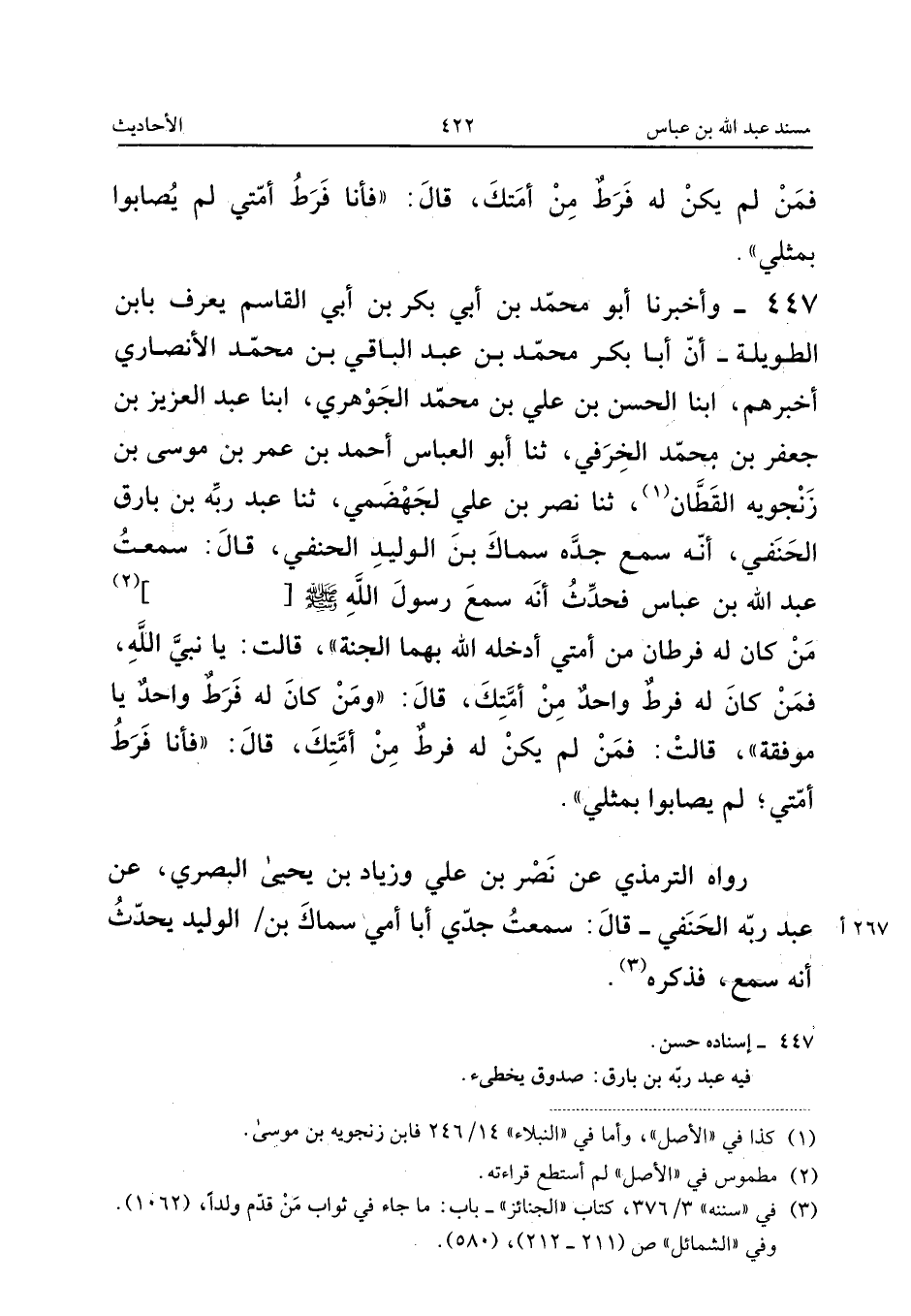 ٤٤٧ - وَأَخْبَرَنَا أَبُو مُحَمَّدِ بْنُ أَبِي بَكْرِ بْنِ أَبِي الْقَاسِمِ يُعْرَفُ بِابْنِ الطَّوِيلَةِ، أَنَّ أَبَا بَكْرٍ مُحَمَّدَ بْنَ عَبْدِ الْبَاقِي بْنِ مُحَمَّدٍ الْأَنْصَارِيَّ أَخْبَرَهُمْ، أَبْنَا الْحَسَنُ بْنُ عَلِيِّ بْنِ مُحَمَّدٍ الْجَوْهَرِيُّ، أَبْنَا عَبْدُ الْعَزِيزِ بْنُ جَعْفَرِ بْنِ مُحَمَّدٍ الْخِرَفِيُّ، ثَنَا أَبُو الْعَبَّاسِ أَحْمَدُ بْنُ عُمَرَ بْنِ مُوسَى بْنِ زَنْجُوَيْهِ الْقَطَّانُ، ثَنَا نَصْرُ بْنُ عَلِيٍّ الْجَهْضَمِيُّ، ثَنَا عَبْدُ رَبِّهِ بْنُ بَارِقٍ الْحَنَفِيُّ أَنَّهُ سَمِعَ جَدَّهُ سِمَاكَ بْنَ الْوَلِيدِ الْحَنَفِيَّ، قَالَ: سَمِعْتُ عَبْدَ اللهِ بْنَ عَبَّاسٍ، فَحَدَّثَ أَنَّهُ سَمِعَ رَسُولَ اللهِ صَلَّى اللهُ عَلَيْهِ وَسَلَّمَ [ ............ ] «مَنْ كَانَ لَهُ فَرَطَانِ مِنْ أُمَّتِي أَدْخَلَهُ اللهُ بِهِمَا الْجَنَّةَ، قَالَتْ: يَا نَبِيَّ اللهِ، فَمَنْ كَانَ لَهُ فَرَطٌ وَاحِدٌ مِنْ أُمَّتِكَ؟ قَالَ: وَمَنْ كَانَ لَهُ فَرَطٌ وَاحِدٌ يَا مُوَفَّقَةُ، قَالَتْ: فَمَنْ لَمْ يَكُنْ لَهُ فَرَطٌ مِنْ أُمَّتِكَ؟ قَالَ: فَأَنَا فَرَطُ أُمَّتِي، لَمْ يُصَابُوا بِمِثْلِي».