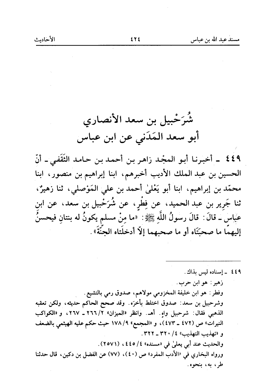 ٤٤٩ - أَخْبَرَنَا أَبُو الْمَجْدِ زَاهِرُ بْنُ أَحْمَدَ بْنِ حَامِدٍ الثَّقَفِيُّ أَنَّ الْحُسَيْنَ بْنَ عَبْدِ الْمَلِكِ الْأَدِيبَ أَخْبَرَهُمْ، أَبْنَا إِبْرَاهِيمُ بْنُ مَنْصُورٍ، أَبْنَا مُحَمَّدُ بْنُ إِبْرَاهِيمَ، أَبْنَا أَبُو يَعْلَى أَحْمَدُ بْنُ عَلِيٍّ الْمَوْصِلِيُّ، ثَنَا زُهَيْرٌ، ثَنَا جَرِيرُ بْنُ عَبْدِ الْحَمِيدِ، عَنْ فِطْرٍ، عَنْ شُرَحْبِيلَ بْنِ سَعْدٍ، عَنِ ابْنِ عَبَّاسٍ، قَالَ: قَالَ رَسُولُ اللهِ صَلَّى اللهُ عَلَيْهِ وَسَلَّمَ: «مَا مِنْ مُسْلِمٍ يَكُونُ لَهُ بِنْتَانِ فَيُحْسِنُ إِلَيْهِمَا مَا صَحِبَتَاهُ أَوْ مَا صَحِبَهُمَا إِلَّا أَدْخَلَتَاهُ الْجَنَّةَ».