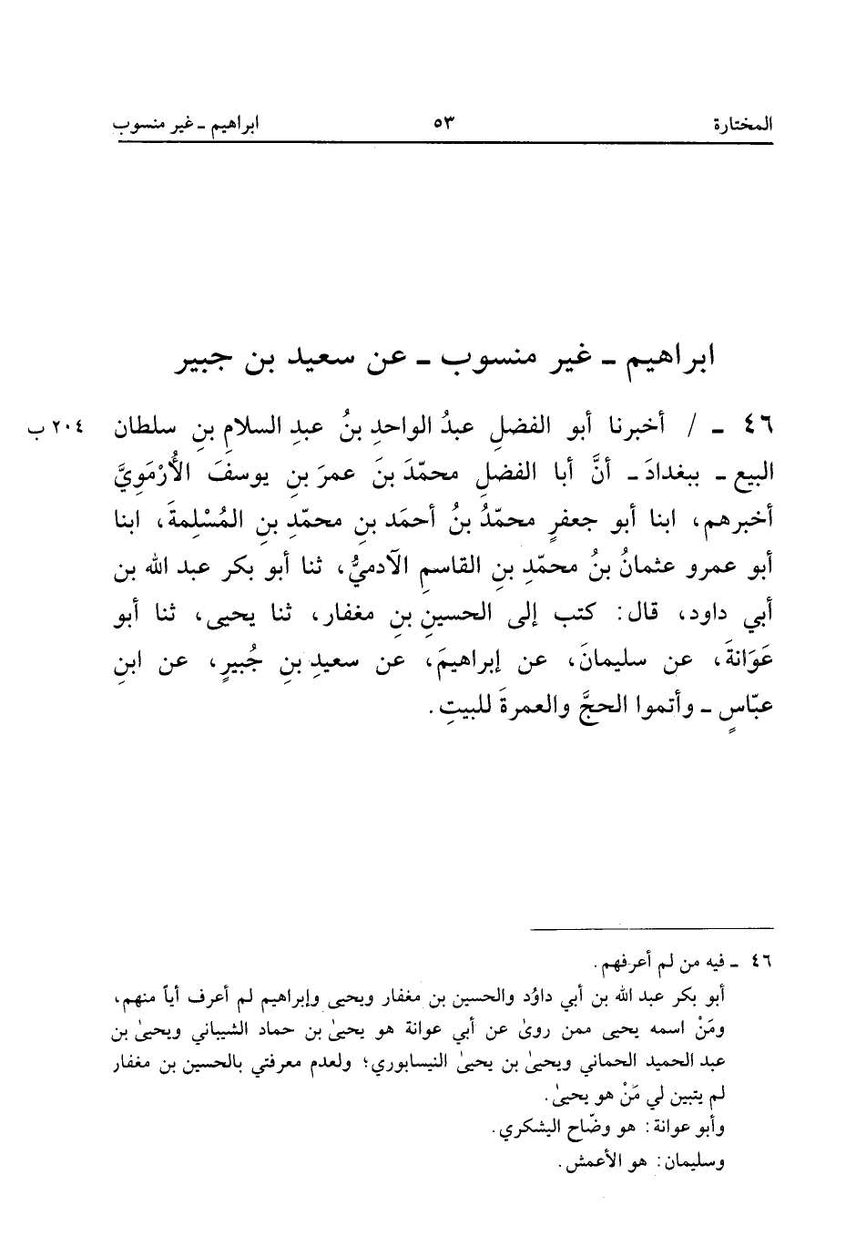 ٤٦ - أَخْبَرَنَا أَبُو الْفَضْلِ عَبْدُ الْوَاحِدِ بْنُ عَبْدِ السَّلَامِ بْنِ سُلْطَانَ الْبَيِّعُ - بِبَغْدَادَ - أَنَّ أَبَا الْفَضْلِ مُحَمَّدَ بْنَ عُمَرَ بْنِ يُوسُفَ الْأُرْمَوِيَّ أَخْبَرَهُمْ، أَبْنَا أَبُو جَعْفَرٍ مُحَمَّدُ بْنُ أَحْمَدَ بْنِ مُحَمَّدِ بْنِ الْمُسْلِمَةِ، أَبْنَا أَبُو عَمْرٍو عُثْمَانُ بْنُ مُحَمَّدِ بْنِ الْقَاسِمِ الْآدَمِيُّ، ثَنَا أَبُو بَكْرٍ عَبْدُ اللهِ بْنُ أَبِي دَاوُدَ قَالَ: كَتَبَ إِلَى الْحُسَيْنِ بْنِ مِغْفَارٍ، ثَنَا يَحْيَى، ثَنَا أَبُو عَوَانَةَ، عَنْ سُلَيْمَانَ، عَنْ إِبْرَاهِيمَ، عَنْ سَعِيدِ بْنِ جُبَيْرٍ، عَنِ ابْنِ عَبَّاسٍ: «(وَأَتِمُّوا الْحَجَّ وَالْعُمْرَةَ لِلْبَيْتِ)».