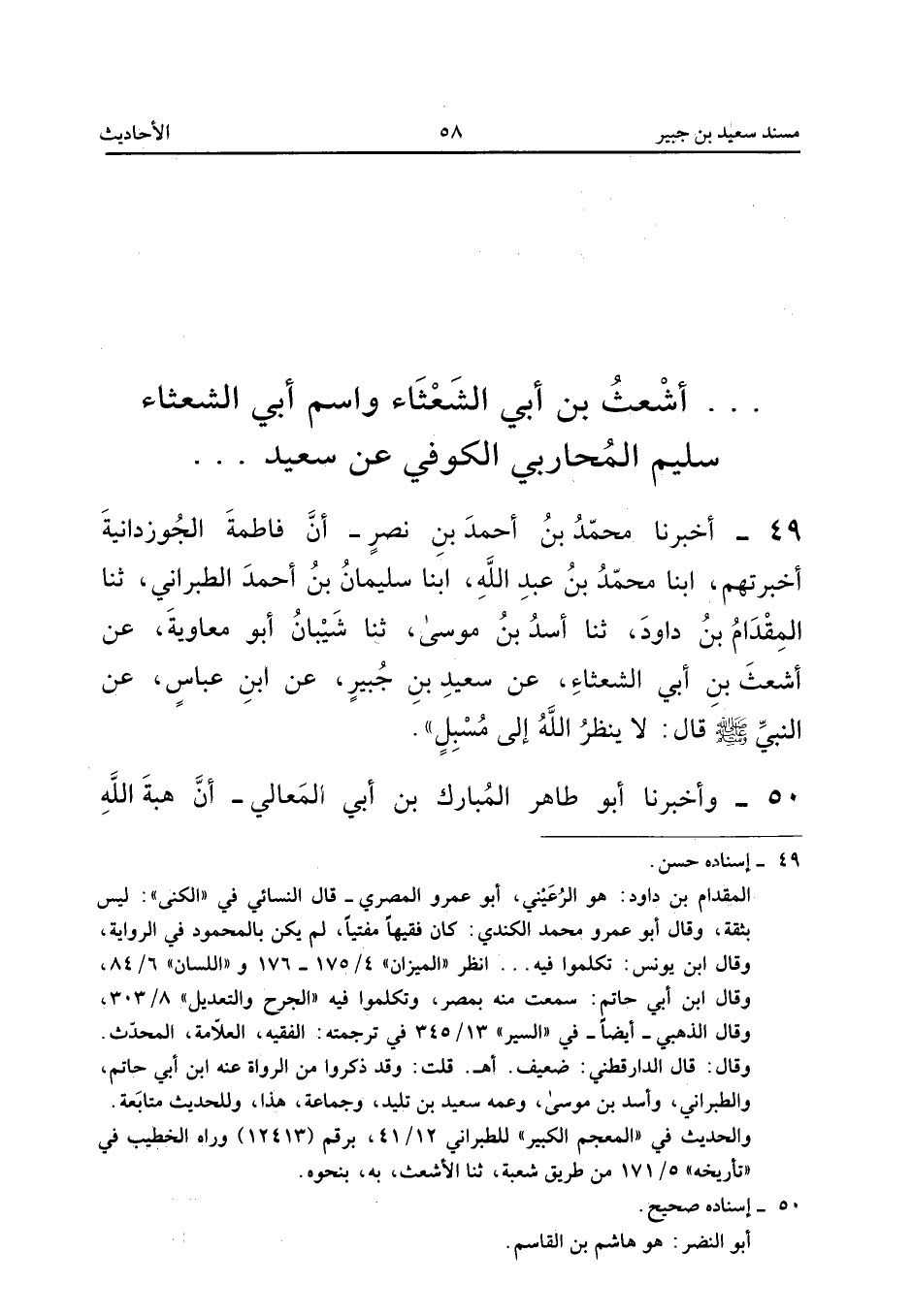 ٤٩ - أَخْبَرَنَا مُحَمَّدُ بْنُ أَحْمَدَ بْنِ نَصْرٍ أَنَّ فَاطِمَةَ الْجُوزْدَانِيَّةَ أَخْبَرَتْهُمْ، أَبْنَا مُحَمَّدُ بْنُ عَبْدِ اللهِ، أَبْنَا سُلَيْمَانُ بْنُ أَحْمَدَ الطَّبَرَانِيُّ، ثَنَا الْمِقْدَامُ بْنُ دَاوُدَ، ثَنَا أَسَدُ بْنُ مُوسَى، ثَنَا شَيْبَانُ أَبُو مُعَاوِيَةَ، عَنْ أَشْعَثَ بْنِ أَبِي الشَّعْثَاءِ، عَنْ سَعِيدِ بْنِ جُبَيْرٍ، عَنِ ابْنِ عَبَّاسٍ، عَنِ النَّبِيِّ صَلَّى اللهُ عَلَيْهِ وَسَلَّمَ قَالَ «: لَا يَنْظُرُ اللهُ إِلَى مُسْبِلٍ».