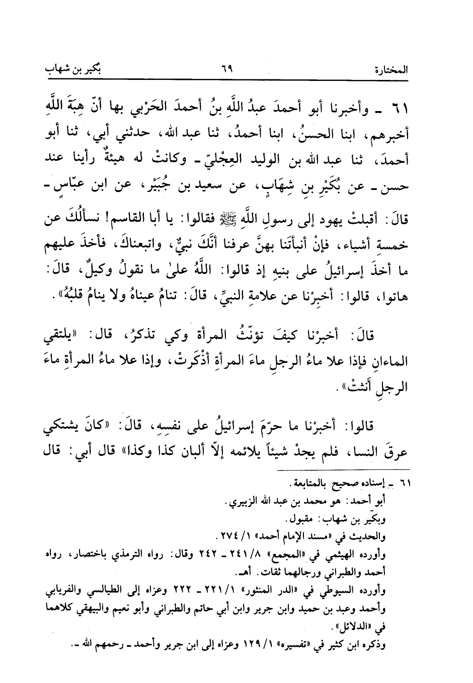 ٦١ - وَأَخْبَرَنَا أَبُو أَحْمَدَ عَبْدُ اللهِ بْنُ أَحْمَدَ الْحَرْبِيُّ (¬١) - بِهَا - أَنَّ هِبَةَ اللهِ أَخْبَرَهُمْ، أَبْنَا الْحَسَنُ، أَبْنَا أَحْمَدُ، ثَنَا عَبْدُ اللهِ، حَدَّثَنِي أَبِي، ثَنَا أَبُو أَحْمَدَ، ثَنَا عَبْدُ اللهِ بْنُ الْوَلِيدِ الْعِجْلِيُّ وَكَانَتْ لَهُ هَيْئَةٌ رَأَيْنَا عِنْدَ حَسَنٍ، عَنْ بُكَيْرِ بْنِ شِهَابٍ، عَنْ سَعِيدِ بْنِ جُبَيْرٍ، عَنِ ابْنِ عَبَّاسٍ قَالَ: «أَقْبَلَتْ يَهُودُ إِلَى رَسُولِ اللهِ صَلَّى اللهُ عَلَيْهِ وَسَلَّمَ فَقَالُوا: يَا أَبَا الْقَاسِمِ، نَسْأَلُكَ عَنْ خَمْسَةِ أَشْيَاءَ فَإِنْ أَنْبَأْتَنَا بِهِنَّ عَرَفْنَا أَنَّكَ نَبِيٌّ وَاتَّبَعْنَاكَ، فَأَخَذَ عَلَيْهِمْ مَا أَخَذَ إِسْرَائِيلُ عَلَى بَنِيهِ إِذْ قَالُوا: اللهُ عَلَى مَا نَقُولُ وَكِيلٌ، قَالَ: هَاتُوا، قَالُوا: أَخْبِرْنَا عَنْ عَلَامَةِ النَّبِيِّ، قَالَ: تَنَامُ عَيْنَاهُ وَلَا يَنَامُ قَلْبُهُ.