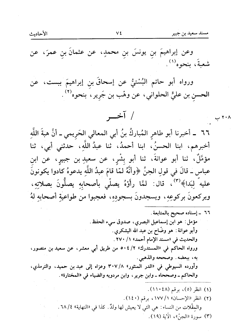 ٦٦ - أَخْبَرَنَا أَبُو طَاهِرٍ الْمُبَارَكُ بْنُ أَبِي الْمَعَالِي الْحَرِيمِيُّ أَنَّ هِبَةَ اللهِ أَخْبَرَهُمْ، أَبْنَا الْحَسَنُ، أَبْنَا أَحْمَدُ، ثَنَا عَبْدُ اللهِ، حَدَّثَنِي أَبِي، ثَنَا مُؤَمَّلٌ، ثَنَا أَبُو عَوَانَةَ، ثَنَا أَبُو بِشْرٍ، عَنْ سَعِيدِ بْنِ جُبَيْرٍ، عَنِ ابْنِ عَبَّاسٍ قَالَ فِي قَوْلِ الْجِنِّ «: {وَأَنَّهُ لَمَّا قَامَ عَبْدُ اللهِ يَدْعُوهُ كَادُوا يَكُونُونَ عَلَيْهِ لِبَدًا} قَالَ لَمَّا رَأَوْهُ يُصَلِّي بِأَصْحَابِهِ يُصَلُّونَ بِصَلَاتِهِ، وَيَرْكَعُونَ بِرُكُوعِهِ وَيَسْجُدُونَ بِسُجُودِهِ فَعَجِبُوا مِنْ طَوَاعِيَةِ أَصْحَابِهِ لَهُ