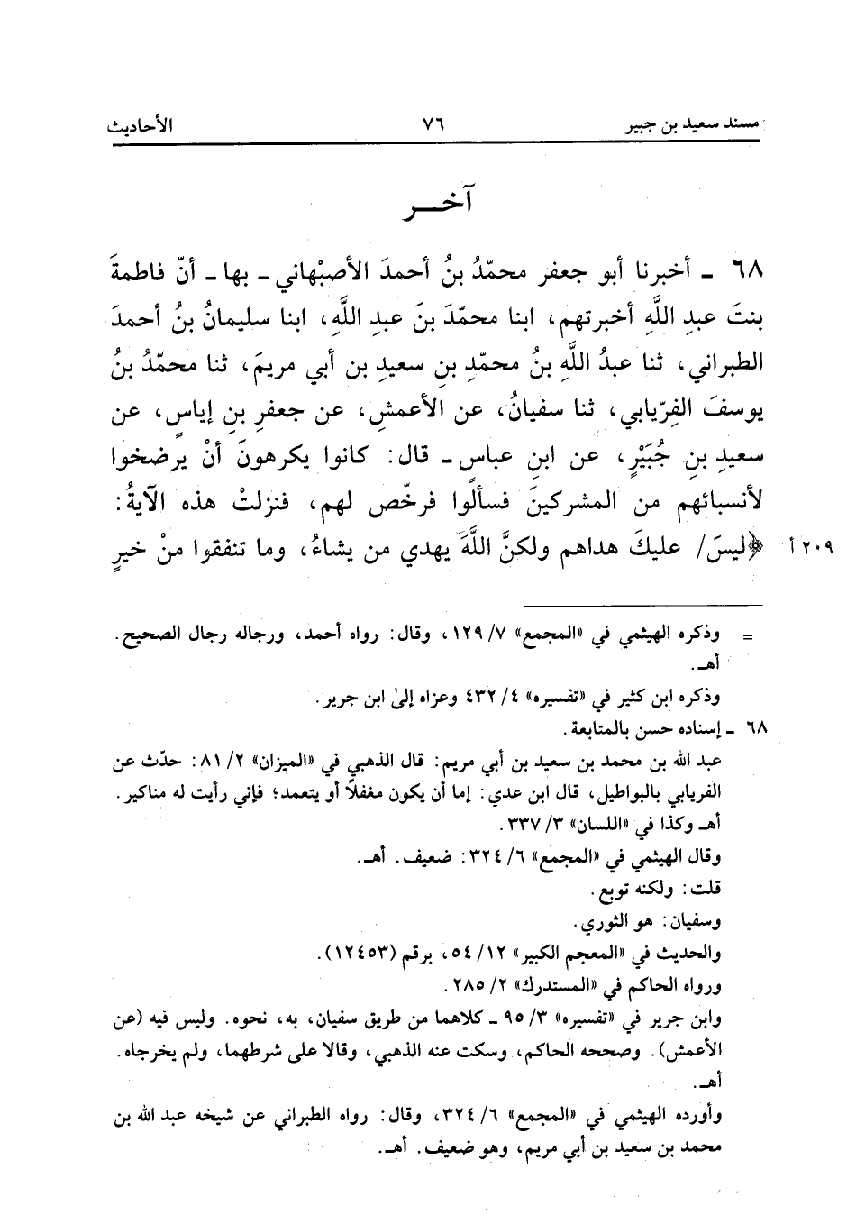 ٦٨ - أَخْبَرَنَا أَبُو جَعْفَرٍ مُحَمَّدُ بْنُ أَحْمَدَ الْأَصْبَهَانِيُّ - بِهَا - أَنَّ فَاطِمَةَ بِنْتَ عَبْدِ اللهِ أَخْبَرَتْهُمْ، أَبْنَا مُحَمَّدُ بْنُ عَبْدِ اللهِ، أَبْنَا سُلَيْمَانُ بْنُ أَحْمَدَ الطَّبَرَانِيُّ، ثَنَا عَبْدُ اللهِ بْنُ مُحَمَّدِ بْنِ سَعِيدِ بْنِ أَبِي مَرْيَمَ، ثَنَا مُحَمَّدُ بْنُ يُوسُفَ الْفِرْيَابِيُّ، ثَنَا سُفْيَانُ، عَنِ الْأَعْمَشِ، عَنْ جَعْفَرِ بْنِ إِيَاسٍ، عَنْ سَعِيدِ بْنِ جُبَيْرٍ، عَنِ ابْنِ عَبَّاسٍ قَالَ: «كَانُوا يَكْرَهُونَ أَنَّ يَرْضَخُوا لِأَنْسِبَائِهِمْ مِنَ الْمُشْرِكِينَ فَسَأَلُوا فَرَخَّصَ لَهُمْ، فَنَزَلَتْ هَذِهِ الْآيَةُ: {لَيْسَ عَلَيْكَ هُدَاهُمْ وَلَكِنَّ اللهَ يَهْدِي مَنْ يَشَاءُ وَمَا تُنْفِقُوا مِنْ خَيْرٍ فَلأَنْفُسِكُمْ}
