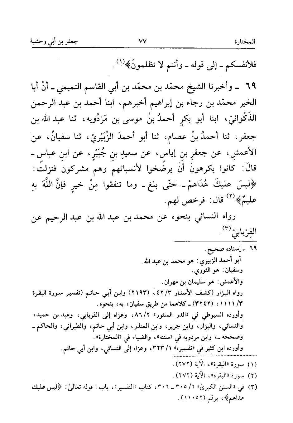 ٦٩ - وَأَخْبَرَنَا الشَّيْخُ مُحَمَّدُ بْنُ مُحَمَّدِ بْنِ أَبِي الْقَاسِمِ التَّمِيمِيُّ أَنَّ أَبَا الْخَيْرِ مُحَمَّدَ بْنَ رَجَاءِ بْنِ إِبْرَاهِيمَ، أَبْنَا أَحْمَدُ بْنُ عَبْدِ الرَّحْمَنِ الذَّكْوَانِيُّ، أَبْنَا أَبُو بَكْرٍ أَحْمَدُ بْنُ مُوسَى بْنِ مَرْدُوَيْهِ، ثَنَا عَبْدُ اللهِ بْنُ جَعْفَرٍ، ثَنَا أَحْمَدُ بْنُ عِصَامٍ، ثَنَا أَبُو أَحْمَدَ الزُّبَيْرِيُّ، ثَنَا سُفْيَانُ، عَنِ الْأَعْمَشِ، عَنْ جَعْفَرِ بْنِ إِيَاسٍ، عَنْ سَعِيدِ بْنِ جُبَيْرٍ، عَنِ ابْنِ عَبَّاسٍ قَالَ: «كَانُوا يَكْرَهُونَ أَنْ يَرْضَخُوا لِأَنْسِبَائِهِمْ وَهُمْ مُشْرِكُونَ، فَنَزَلَتْ: {لَيْسَ عَلَيْكَ هُدَاهُمْ} حَتَّى بَلَغَ: {وَمَا تُنْفِقُوا مِنْ خَيْرٍ فَإِنَّ اللهَ بِهِ عَلِيمٌ} قَالَ: فَرَخَّصَ لَهُمْ».