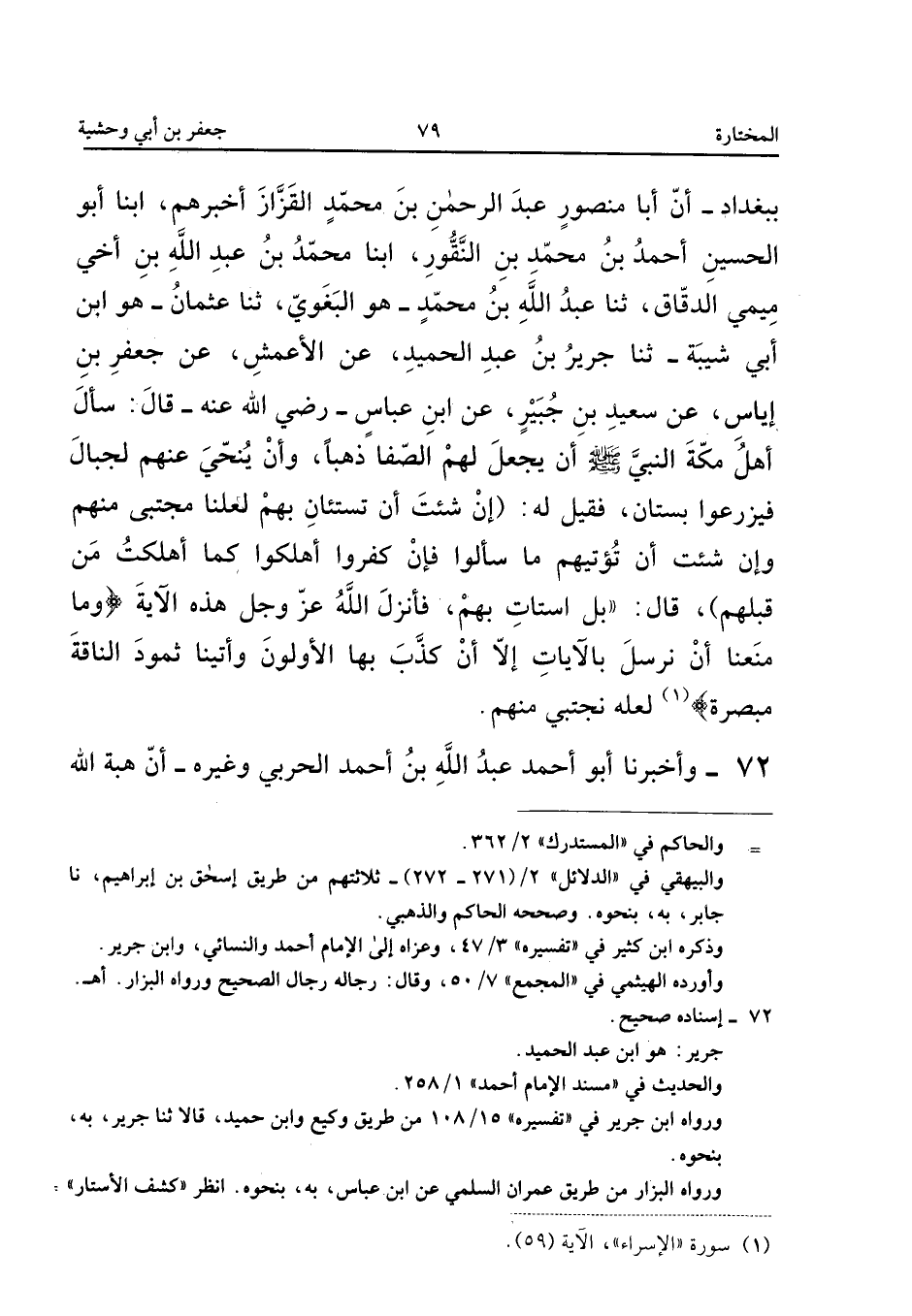 أَخْبَرَهُمْ، أَبْنَا الْحَسَنُ، أَبْنَا أَحْمَدُ، ثَنَا عَبْدُ اللهِ، حَدَّثَنِي أَبِي، ثَنَا عُثْمَانُ بْنُ مُحَمَّدٍ وَسَمِعْتُهُ مِنْهُ، ثَنَا جَرِيرٌ، عَنِ الْأَعْمَشِ، عَنْ جَعْفَرِ بْنِ إِيَاسٍ، عَنْ سَعِيدِ بْنِ جُبَيْرٍ، عَنِ ابْنِ عَبَّاسٍ قَالَ: «سَأَلَ أَهْلُ مَكَّةَ النَّبِيَّ صَلَّى اللهُ عَلَيْهِ وَسَلَّمَ أَنْ يَجْعَلَ لَهُمُ الصَّفَا ذَهَبًا، وَأَنْ يُنَحِّيَ الْجِبَالَ عَنْهُمْ فَيَزْدَرِعُوا فَقِيلَ لَهُ: إِنْ شِئْتَ أَنْ تَسْتَأْنِيَ بِهِمْ، وَإِنْ شِئْتَ أَنْ تُؤْتِيَهُمُ الَّذِينَ سَأَلُوا؛ فَإِنْ كَفَرُوا أُهْلِكُوا كَمَا أَهْلَكْتُ مَنْ قَبْلَهُمْ، قَالَ: لَا؛ بَلْ أَسْتَأْنِي بِهِمْ، فَأَنْزَلَ اللهُ عَزَّ وَجَلَّ: {وَمَا مَنَعَنَا أَنْ نُرْسِلَ بِالآيَاتِ إِلا أَنْ كَذَّبَ بِهَا الأَوَّلُونَ وَآتَيْنَا ثَمُودَ النَّاقَةَ مُبْصِرَةً}».