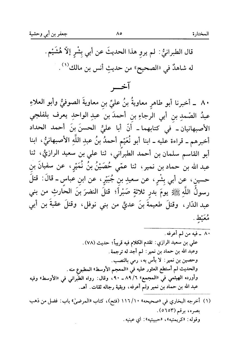 ٨٠ - أَخْبَرَنَا أَبُو طَاهِرٍ مُعَاوِيَةُ بْنُ عَلِيِّ بْنِ مُعَاوِيَةَ الصُّوفِيُّ وَأَبُو الْعَلَاءِ عَبْدُ الصَّمَدِ بْنُ أَبِي الرَّجَاءِ بْنِ أَحْمَدَ بْنِ عَبْدِ الْوَاحِدِ يُعْرَفُ بِالْفَلْجِيِّ الْأَصْبَهَانِيَّانِ - فِي كِتَابِهِمَا - أَنَّ أَبَا عَلِيٍّ الْحَسَنَ بْنَ أَحْمَدَ الْحَدَّادَ أَخْبَرَهُمْ - قِرَاءَةً عَلَيْهِ - أَبْنَا أَبُو نُعَيْمٍ أَحْمَدُ بْنُ عَبْدِ اللهِ الْأَصْبَهَانِيُّ، أَبْنَا أَبُو الْقَاسِمِ سَلْمَانُ بْنُ أَحْمَدَ الطَّبَرَانِيُّ، ثَنَا عَلِيُّ بْنُ سَعِيدٍ الرَّازِيُّ، ثَنَا عَبْدُ اللهِ بْنُ حَمَّادِ بْنِ نُمَيْرٍ، ثَنَا عَمِّي حُصَيْنُ بْنُ نُمَيْرٍ، عَنْ سُفْيَانَ بْنِ حُسَيْنٍ، عَنْ أَبِي بِشْرٍ، عَنْ سَعِيدِ بْنِ جُبَيْرٍ، عَنِ ابْنِ عَبَّاسٍ قَالَ: «قَتَلَ رَسُولُ اللهِ صَلَّى اللهُ عَلَيْهِ وَسَلَّمَ يَوْمَ بَدْرٍ ثَلَاثَةً صَبْرًا: قَتَلَ النَّضْرَ بْنَ الْحَارِثِ مِنْ بَنِي عَبْدِ الدَّارِ، وَقَتَلَ طُعَيْمَةَ بْنَ عَدِيٍّ مِنْ بَنِي نَوْفَلٍ، وَقَتَلَ عُقْبَةَ بْنَ أَبِي مُعَيْطٍ».