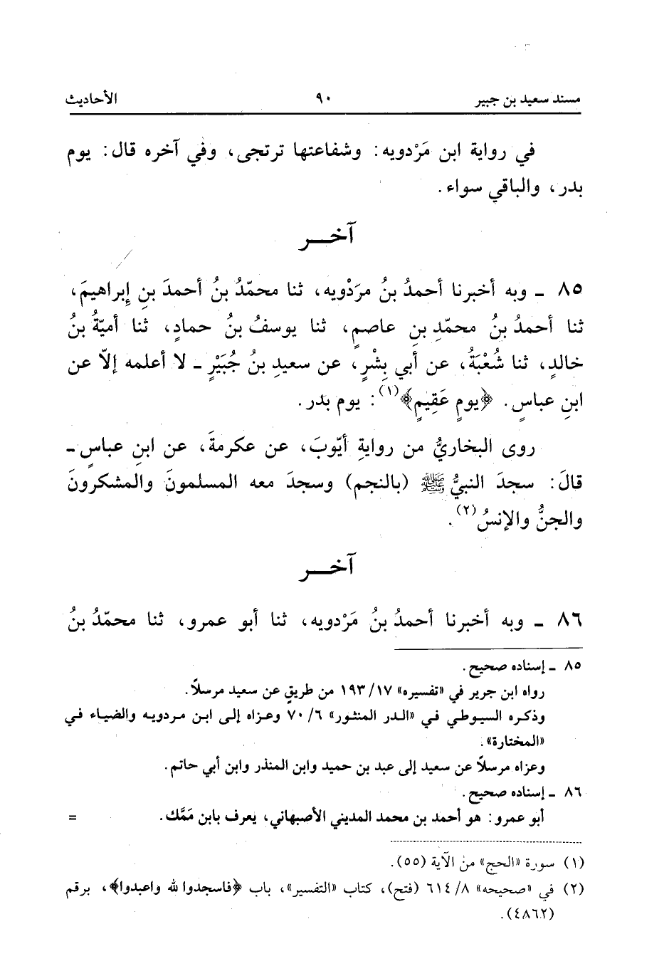 ٨٥ - وَبِهِ أَخْبَرَنَا أَحْمَدُ بْنُ مَرْدُوَيْهِ، ثَنَا مُحَمَّدُ بْنُ أَحْمَدَ بْنِ إِبْرَاهِيمَ، ثَنَا أَحْمَدُ بْنُ مُحَمَّدِ بْنِ عَاصِمٍ، ثَنَا يُوسُفُ بْنُ حَمَّادٍ، ثَنَا أُمَيَّةُ بْنُ خَالِدٍ، ثَنَا شُعْبَةُ، عَنْ أَبِي بِشْرٍ، عَنْ سَعِيدِ بْنِ جُبَيْرٍ لَا أَعْلَمُهُ إِلَّا عَنِ ابْنِ عَبَّاسٍ: «يَوْمٍ عَقِيمٍ يَوْمُ بَدْرٍ».