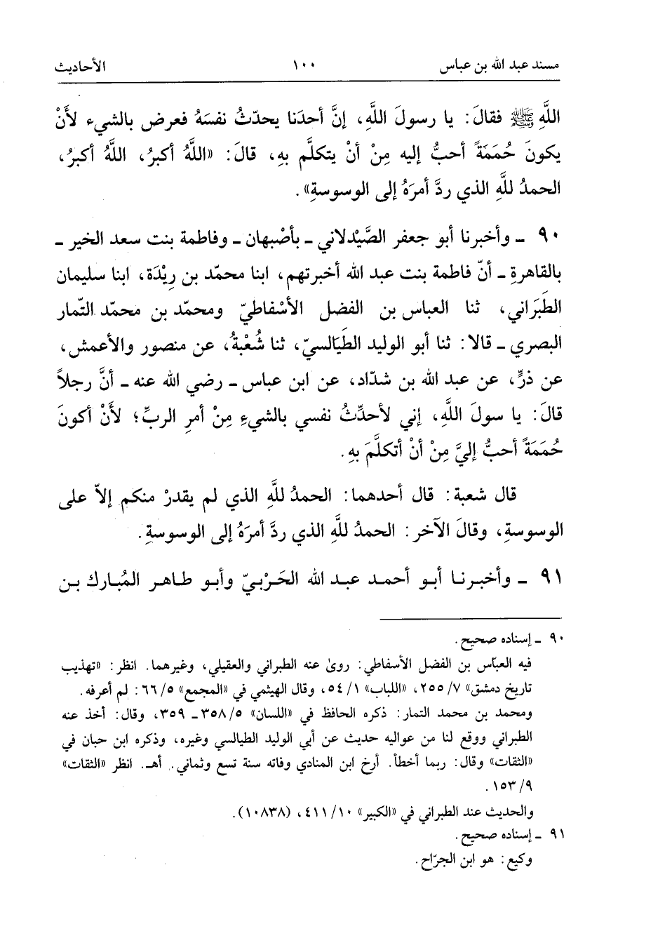 الْمَعْطُوشِ - أَنَّ هِبَةَ اللهِ أَخْبَرَهُمْ، أَبْنَا الْحَسَنُ، أَبْنَا أَحْمَدُ، ثَنَا عَبْدُ اللهِ، حَدَّثَنِي أَبِي، ثَنَا وَكِيعٌ، ثَنَا سُفْيَانُ، عَنْ مَنْصُورٍ، عَنْ ذَرِّ بْنِ عَبْدِ اللهِ الْهَمْدَانِيِّ، عَنْ عَبْدِ اللهِ بْنِ شَدَّادٍ، عَنِ ابْنِ عَبَّاسٍ، قَالَ: «جَاءَ رَجُلٌ إِلَى النَّبِيِّ - صَلَّى اللهُ عَلَيْهِ وَسَلَّمَ - فَقَالَ: يَا رَسُولَ اللهِ، إِنِّي أُحَدِّثُ نَفْسِي بِالشَّيْءِ لَأَنْ أَخِرَّ مِنَ السَّمَاءِ أَحَبُّ إِلَيَّ مِنْ أَنْ أَتَكَلَّمَ بِهِ، قَالَ: فَقَالَ النَّبِيُّ - صَلَّى اللهُ عَلَيْهِ وَسَلَّمَ -: اللهُ أَكْبَرُ، اللهُ أَكْبَرُ، الْحَمْدُ لِلهِ الَّذِي رَدَّ كَيْدَهُ إِلَى الْوَسْوَسَةِ».