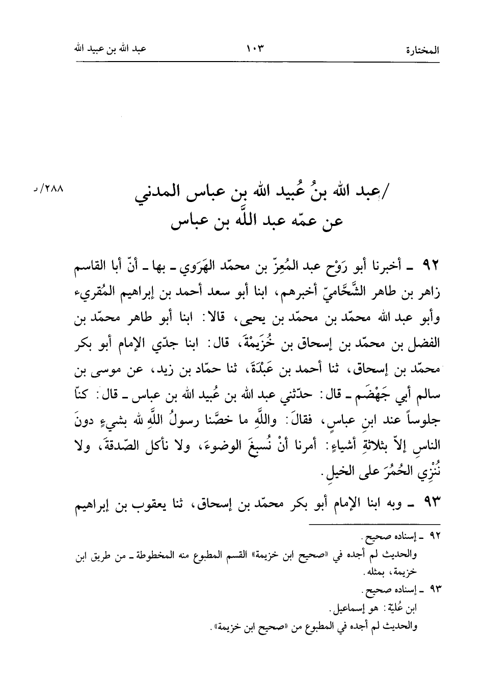 ٩٢ - أَخْبَرَنَا أَبُو رَوْحٍ عَبْدُ الْمُعِزِّ بْنُ مُحَمَّدٍ الْهَرَوِيُّ - بِهَا - أَنَّ أَبَا الْقَاسِمِ زَاهِرَ بْنَ طَاهِرٍ الشَّحَّامِيَّ أَخْبَرَهُمْ، أَبْنَا أَبُو سَعْدٍ أَحْمَدُ بْنُ إِبْرَاهِيمَ الْمُقْرِئُ، وَأَبُو عَبْدِ اللهِ مُحَمَّدُ بْنُ مُحَمَّدِ بْنِ يَحْيَى، قَالَا: أَبْنَا أَبُو طَاهِرٍ مُحَمَّدُ بْنُ الْفَضْلِ بْنِ مُحَمَّدِ بْنِ إِسْحَاقَ بْنِ خُزَيْمَةَ، قَالَ: أَبْنَا جَدِّي الْإِمَامُ أَبُو بَكْرٍ مُحَمَّدُ بْنُ إِسْحَاقَ، ثَنَا أَحْمَدُ بْنُ عَبْدَةَ، ثَنَا حَمَّادُ بْنُ زَيْدٍ، عَنْ مُوسَى بْنِ سَالِمٍ أَبِي جَهْضَمٍ قَالَ: حَدَّثَنِي عَبْدُ اللهِ بْنُ عُبَيْدِ اللهِ بْنِ عَبَّاسٍ، قَالَ: «كُنَّا جُلُوسًا عِنْدَ ابْنِ عَبَّاسٍ، فَقَالَ: وَاللهِ مَا خَصَّنَا رَسُولُ اللهِ لِلهِ بِشَيْءٍ دُونَ النَّاسِ إِلَّا بِثَلَاثَةِ أَشْيَاءَ: أَمَرَنَا أَنْ نُسْبِغَ الْوُضُوءَ، وَلَا نَأْكُلَ الصَّدَقَةَ، وَلَا نُنْزِيَ الْحُمُرَ عَلَى الْخَيْلِ».