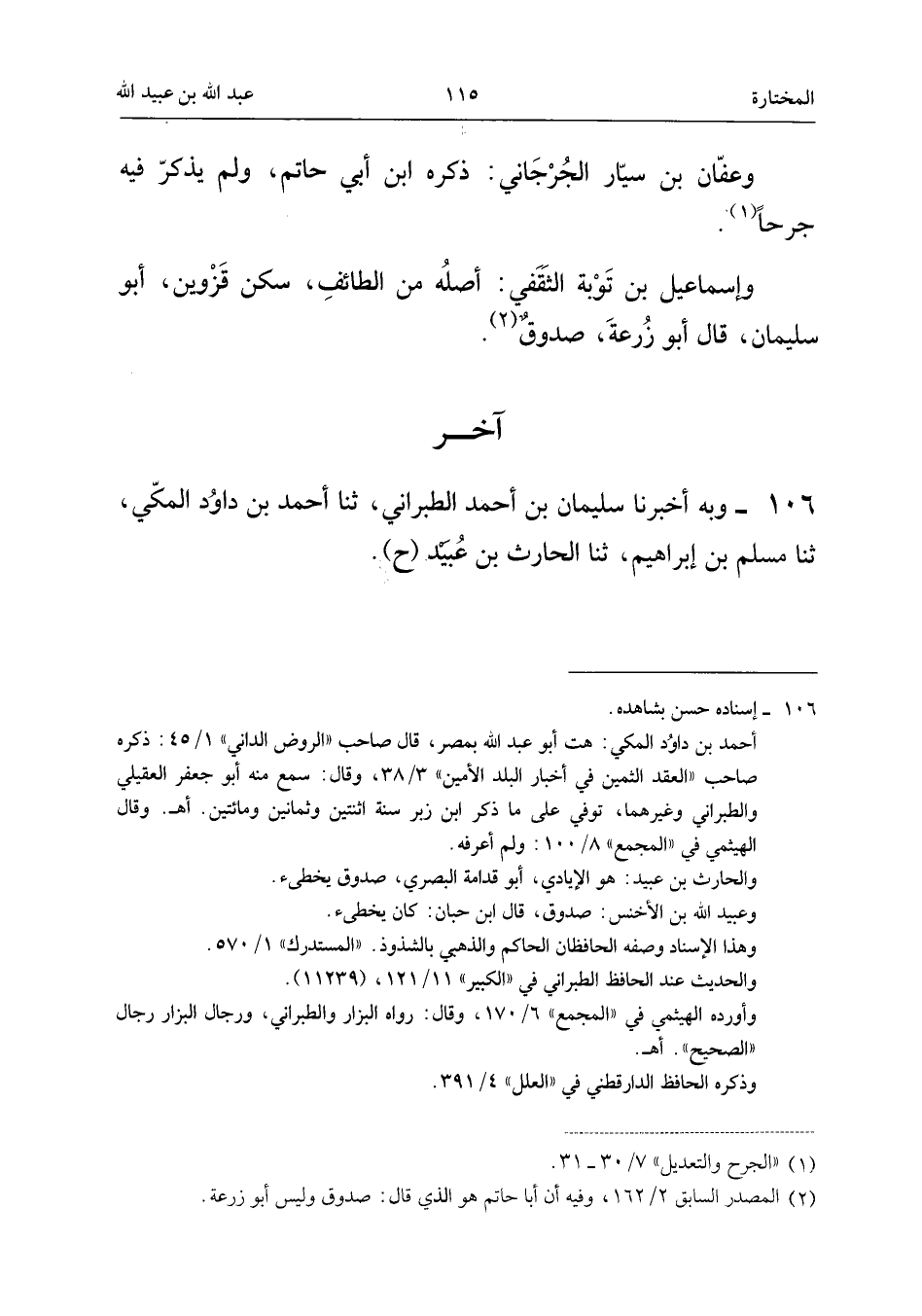 ١٠٦ - وَبِهِ أَخْبَرَنَا سُلَيْمَانُ بْنُ أَحْمَدَ الطَّبَرَانِيُّ، ثَنَا أَحْمَدُ بْنُ دَاوُدَ الْمَكِّيُّ، ثَنَا مُسْلِمُ بْنُ إِبْرَاهِيمَ، ثَنَا الْحَارِثُ بْنُ عُبَيْدٍ (حَ).