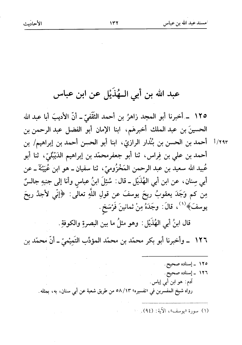 ١٢٥ - أَخْبَرَنَا أَبُو الْمَجْدِ زَاهِرُ بْنُ أَحْمَدَ الثَّقَفِيُّ، أَنَّ الْأَدِيبَ أَبَا عَبْدِ اللهِ الْحُسَيْنَ بْنَ عَبْدِ الْمَلِكِ أَخْبَرَهُمْ، أَبْنَا الْإِمَامُ أَبُو الْفَضْلِ عَبْدُ الرَّحْمَنِ بْنُ أَحْمَدَ بْنِ الْحَسَنِ بْنِ بُنْدَارٍ الرَّازِيُّ، أَبْنَا أَبُو الْحَسَنِ أَحْمَدُ بْنُ إِبْرَاهِيمَ بْنِ أَحْمَدَ بْنِ عَلِيِّ بْنِ فِرَاسٍ، ثَنَا أَبُو جَعْفَرٍ مُحَمَّدُ بْنُ إِبْرَاهِيمَ الدَّيْبُلِيُّ، ثَنَا أَبُو عُبَيْدِ اللهِ سَعِيدُ بْنُ عَبْدِ الرَّحْمَنِ الْمَخْزُومِيُّ، ثَنَا سُفْيَانُ - هُوَ ابْنُ عُيَيْنَةَ - عَنْ أَبِي سِنَانٍ، عَنِ ابْنِ أَبِي الْهُذَيْلِ قَالَ: «سُئِلَ ابْنُ عَبَّاسٍ وَأَنَا إِلَى جَنْبِهِ جَالِسٌ: مِنْ كَمْ وَجَدَ يَعْقُوبُ رِيحَ يُوسُفَ؟ عَنْ قَوْلِ اللهِ تَعَالَى: {إِنِّي لأَجِدُ رِيحَ يُوسُفَ}، قَالَ: وَجَدَهُ مِنْ ثَمَانِينَ فَرْسَخًا».
