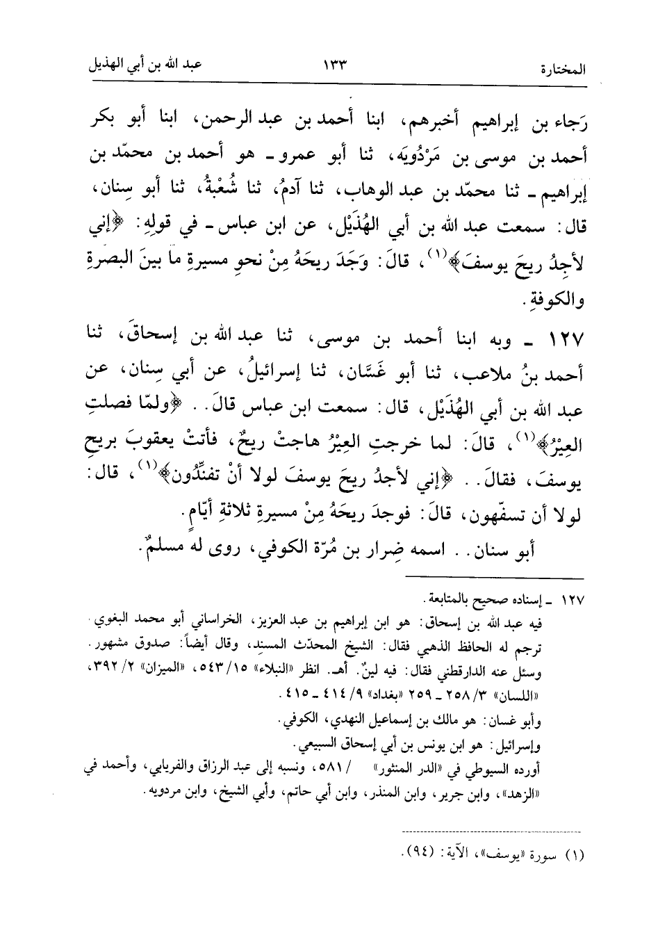 ١٢٧ - وَبِهِ أَبْنَا أَحْمَدُ بْنُ مُوسَى، ثَنَا عَبْدُ اللهِ بْنُ إِسْحَاقَ، ثَنَا أَحْمَدُ بْنُ مُلَاعِبٍ، ثَنَا أَبُو غَسَّانَ، ثَنَا إِسْرَائِيلُ، عَنْ أَبِي سِنَانٍ، عَنْ عَبْدِ اللهِ بْنِ أَبِي الْهُذَيْلِ قَالَ: سَمِعْتُ ابْنَ عَبَّاسٍ قَالَ. «. {وَلَمَّا فَصَلَتِ الْعِيرُ}، قَالَ: لَمَّا خَرَجَتِ الْعِيرُ هَاجَتْ رِيحٌ، فَأَتَتْ يَعْقُوبَ بِرِيحِ يُوسُفَ، فَقَالَ .. {إِنِّي لأَجِدُ رِيحَ يُوسُفَ لَوْلا أَنْ تُفَنِّدُونِ} قَالَ: لَوْلَا أَنْ تُسَفِّهُونَ، قَالَ: فَوَجَدَ رِيحَهُ مِنْ مَسِيرَةِ ثَلَاثَةِ أَيَّامٍ».