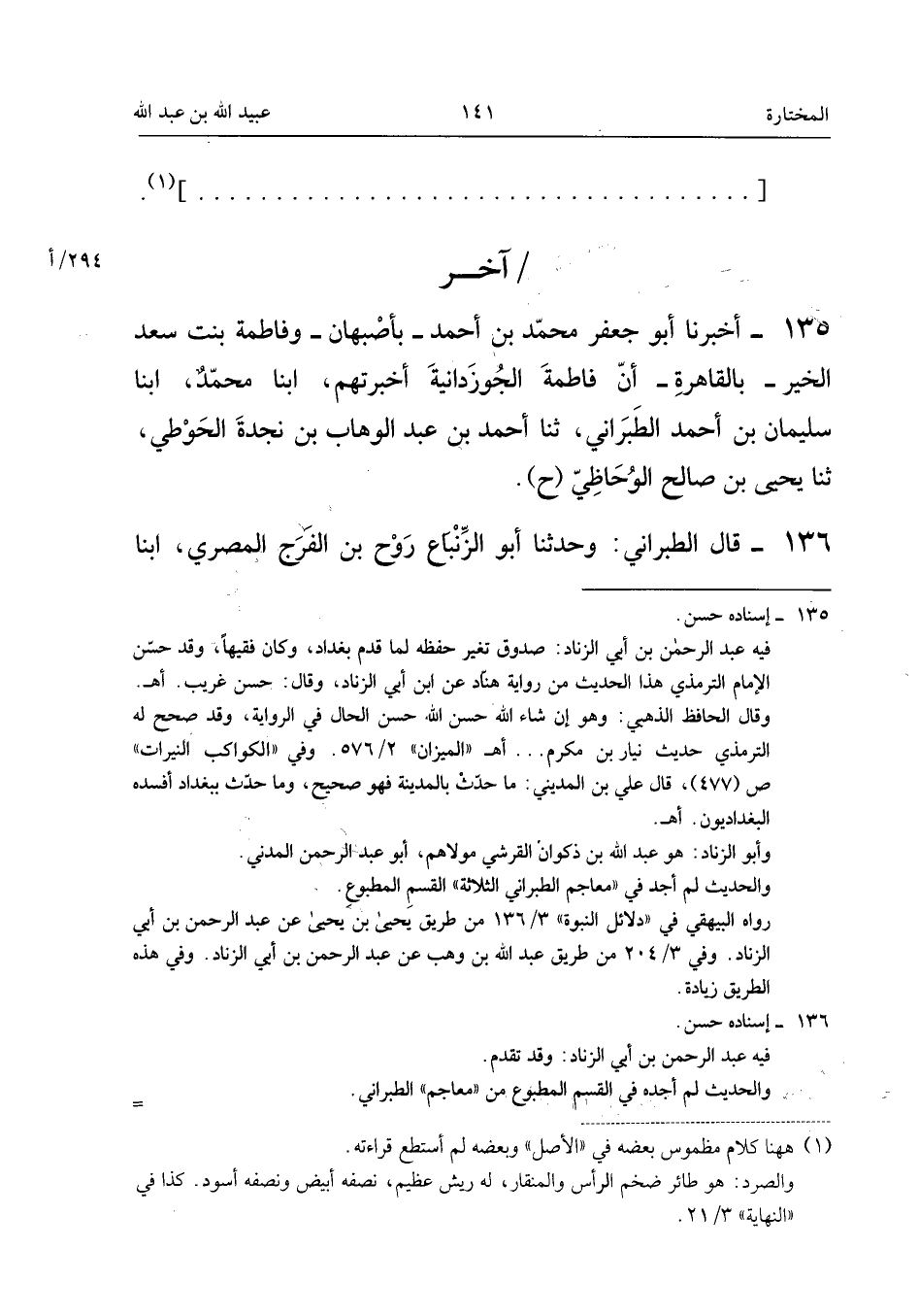 ١٣٥ - أَخْبَرَنَا أَبُو جَعْفَرٍ مُحَمَّدُ بْنُ أَحْمَدَ - بِأَصْبَهَانَ - وَفَاطِمَةُ بِنْتُ سَعْدِ الْخَيْرِ - بِالْقَاهِرَةِ - أَنَّ فَاطِمَةَ الْجُوزْدَانِيَّةَ أَخْبَرَتْهُمْ، أَبْنَا مُحَمَّدٌ، أَبْنَا سُلَيْمَانُ بْنُ أَحْمَدَ الطَّبَرَانِيُّ، ثَنَا أَحْمَدُ بْنُ عَبْدِ الْوَهَّابِ بْنِ نَجْدَةَ الْحَوْطِيُّ، ثَنَا يَحْيَى بْنُ صَالِحٍ الْوُحَاظِيُّ (حَ).