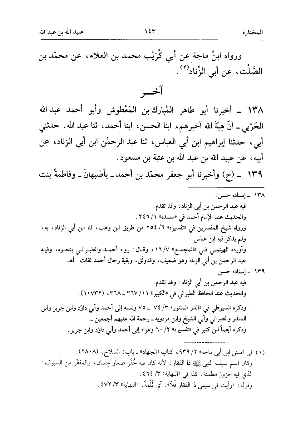 ١٣٨ - أَخْبَرَنَا أَبُو طَاهِرٍ الْمُبَارَكُ بْنُ الْمَعْطُوشِ وَأَبُو أَحْمَدَ عَبْدُ اللهِ الْحَرْبِيُّ (¬١)، أَنَّ هِبَةَ اللهِ أَخْبَرَهُمْ، أَبْنَا الْحَسَنُ، أَبْنَا أَحْمَدُ، ثَنَا عَبْدُ اللهِ، حَدَّثَنِي أَبِي، حَدَّثَنَا إِبْرَاهِيمُ بْنُ أَبِي الْعَبَّاسِ، ثَنَا عَبْدُ الرَّحْمَنِ بْنُ أَبِي الزِّنَادِ، عَنْ أَبِيهِ، عَنْ عُبَيْدِ اللهِ بْنِ عَبْدِ اللهِ بْنِ عُتْبَةَ بْنِ مَسْعُودٍ.