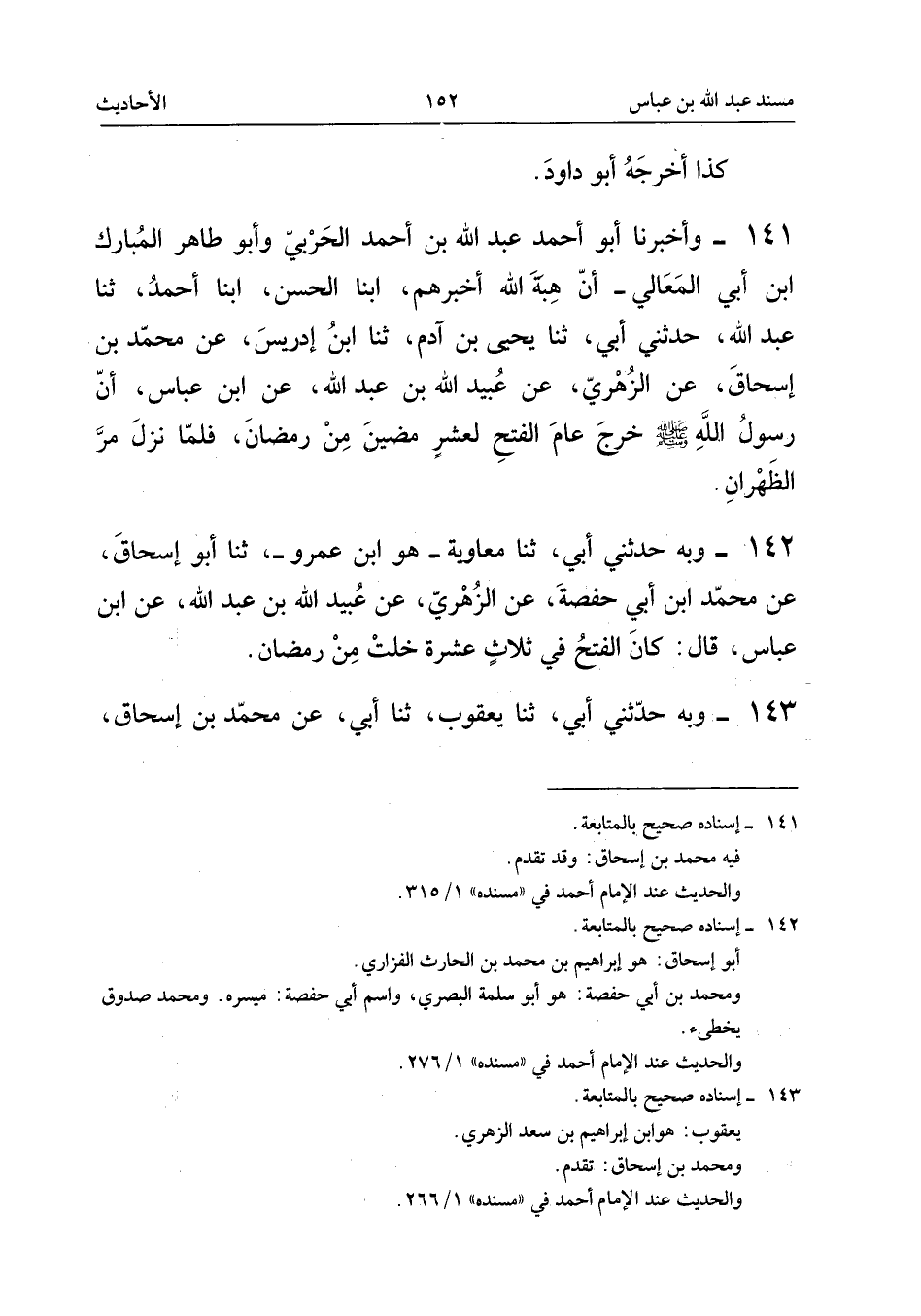 ١٤٢ - وَبِهِ حَدَّثَنِي أَبِي، ثَنَا مُعَاوِيَةُ - هُوَ ابْنُ عَمْرٍو - ثَنَا أَبُو إِسْحَاقَ، عَنْ مُحَمَّدِ بْنِ أَبِي حَفْصَةَ، عَنِ الزُّهْرِيِّ، عَنْ عُبَيْدِ اللهِ بْنِ عَبْدِ اللهِ، عَنِ ابْنِ عَبَّاسٍ قَالَ: «كَانَ الْفَتْحُ فِي ثَلَاثَ عَشْرَةَ خَلَتْ مِنْ رَمَضَانَ».