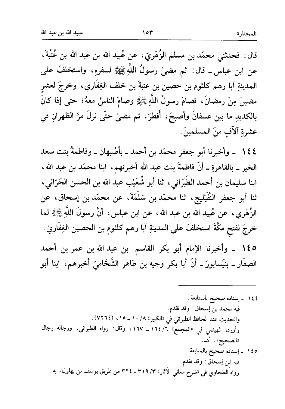 ١٤٤ - وَأَخْبَرَنَا أَبُو جَعْفَرٍ مُحَمَّدُ بْنُ أَحْمَدَ - بِأَصْبَهَانَ - وَفَاطِمَةُ بِنْتُ سَعْدِ الْخَيْرِ - بِالْقَاهِرَةِ - أَنَّ فَاطِمَةَ بِنْتَ عَبْدِ اللهِ أَخْبَرَتْهُمْ، أَبْنَا مُحَمَّدُ بْنُ عَبْدِ اللهِ، أَبْنَا سُلَيْمَانُ بْنُ أَحْمَدَ الطَّبَرَانِيُّ، ثَنَا أَبُو شُعَيْبٍ عَبْدُ اللهِ بْنُ الْحَسَنِ الْحَرَّانِيُّ، ثَنَا أَبُو جَعْفَرٍ النُّفَيْلِيُّ، ثَنَا مُحَمَّدُ بْنُ سَلَمَةَ، عَنْ مُحَمَّدِ بْنِ إِسْحَاقَ، عَنِ الزُّهْرِيِّ، عَنْ عُبَيْدِ اللهِ بْنِ عَبْدِ اللهِ، عَنِ ابْنِ عَبَّاسٍ، «أَنَّ رَسُولَ اللهِ - صَلَّى اللهُ عَلَيْهِ وَسَلَّمَ - لَمَّا خَرَجَ لِفَتْحِ مَكَّةَ اسْتَخْلَفَ عَلَى الْمَدِينَةِ أَبَا رُهْمٍ كُلْثُومَ بْنَ الْحُصَيْنِ الْغِفَارِيَّ».