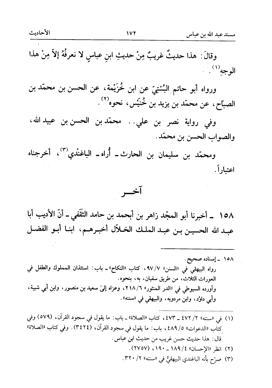 ١٥٨ - أَخْبَرَنَا أَبُو الْمَجْدِ زَاهِرُ بْنُ أَحْمَدَ بْنِ حَامِدٍ الثَّقَفِيُّ - أَنَّ الْأَدِيبَ أَبَا عَبْدِ اللهِ الْحُسَيْنَ بْنَ عَبْدِ الْمَلِكِ الْخَلَّالَ أَخْبَرَهُمْ، أَبْنَا أَبُو الْفَضْلِ