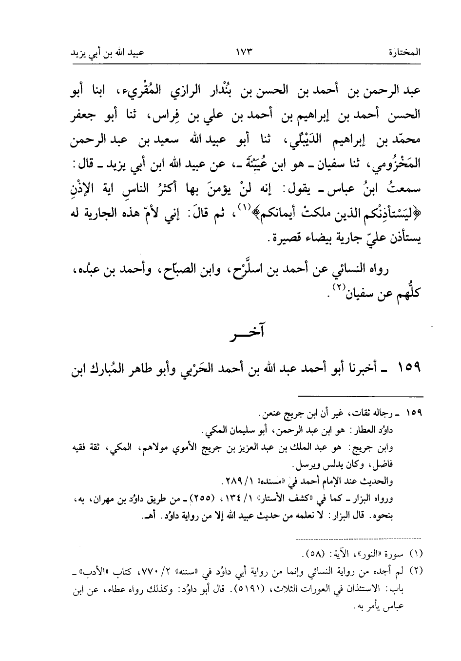 أَبِي الْمَعَالِي الْحَرِيمِيُّ، أَنَّ هِبَةَ اللهِ أَخْبَرَهُمْ، أَبْنَا الْحَسَنُ، أَبْنَا أَحْمَدُ، أَبْنَا عَبْدُ اللهِ، حَدَّثَنِي أَبِي، ثَنَا دَاوُدُ بْنُ مِهْرَانَ، ثَنَا دَاوُدُ - يَعْنِي الْعَطَّارَ - عَنِ ابْنِ جُرَيْجٍ، عَنْ عُبَيْدِ اللهِ بْنِ أَبِي يَزِيدَ، عَنِ ابْنِ عَبَّاسٍ قَالَ: «قَالَ رَجُلٌ: كَمْ يَكْفِينِي مِنَ الْوَضُوءِ؟ - قَالَ: مُدٌّ، قَالَ: كَمْ يَكْفِينِي لِلْغُسْلِ؟ قَالَ: صَاعٌ، قَالَ: قَالَ الرَّجُلُ: لَا يَكْفِينِي، قَالَ: لَا أُمَّ لَكَ، قَدْ كَفَى مَنْ هُوَ خَيْرٌ مِنْكَ؛ رَسُولُ اللهِ - صَلَّى اللهُ عَلَيْهِ وَسَلَّمَ» -.