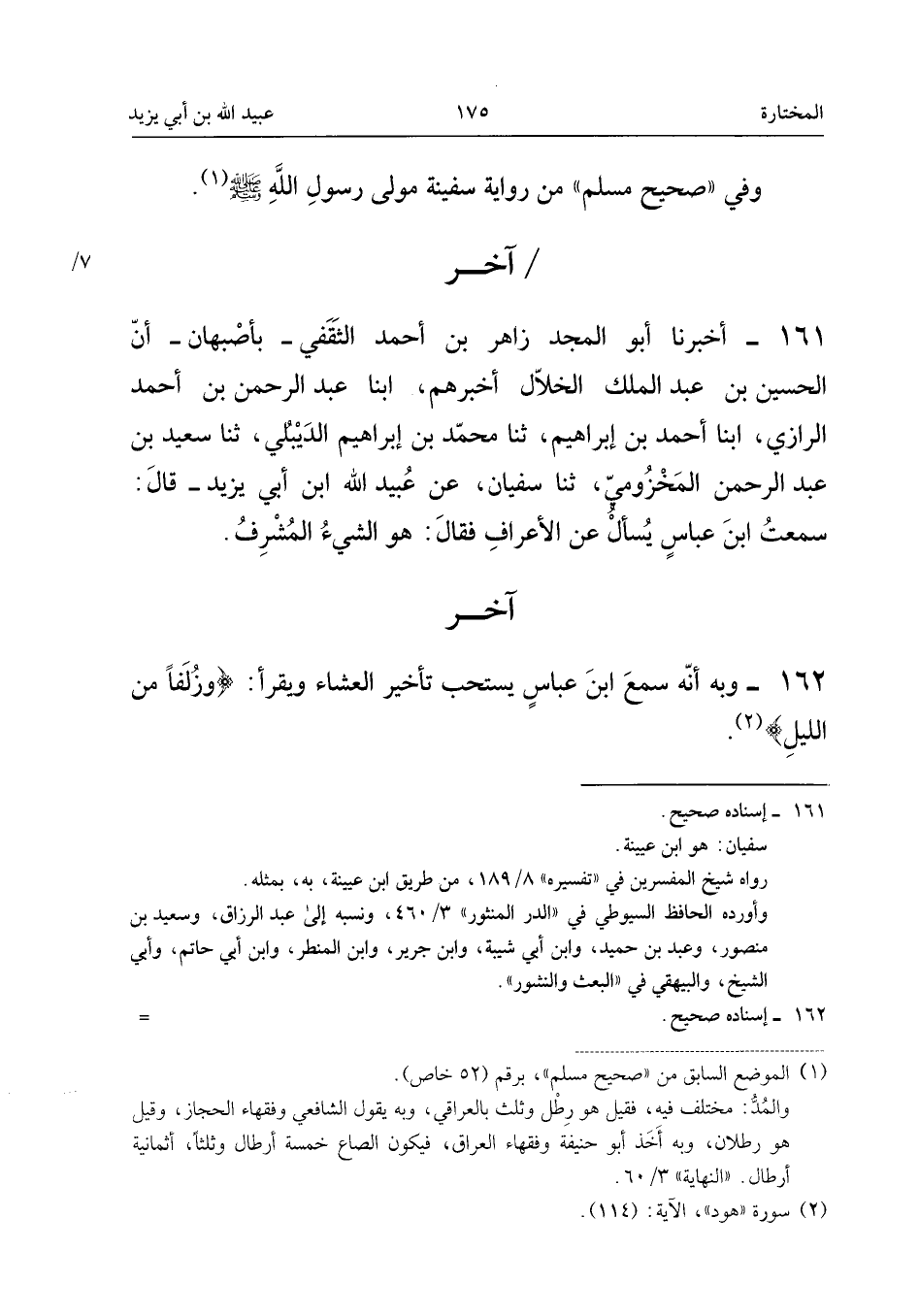 ١٦١ - أَخْبَرَنَا أَبُو الْمَجْدِ زَاهِرُ بْنُ أَحْمَدَ الثَّقَفِيُّ - بِأَصْبَهَانَ - أَنَّ الْحُسَيْنَ بْنَ عَبْدِ الْمَلِكِ الْخَلَّالَ أَخْبَرَهُمْ، أَبْنَا عَبْدُ الرَّحْمَنِ بْنُ أَحْمَدَ الرَّازِيُّ، أَبْنَا أَحْمَدُ بْنُ إِبْرَاهِيمَ، ثَنَا مُحَمَّدُ بْنُ إِبْرَاهِيمَ الدَّيْبُلِيُّ، ثَنَا سَعِيدُ بْنُ عَبْدِ الرَّحْمَنِ الْمَخْزُومِيُّ، ثَنَا سُفْيَانُ، عَنْ عُبَيْدِ اللهِ بْنِ أَبِي يَزِيدَ، قَالَ: «سَمِعْتُ ابْنَ عَبَّاسٍ يُسْأَلُ عَنِ الْأَعْرَافِ، فَقَالَ: هُوَ الشَّيْءُ الْمُشْرِفُ».