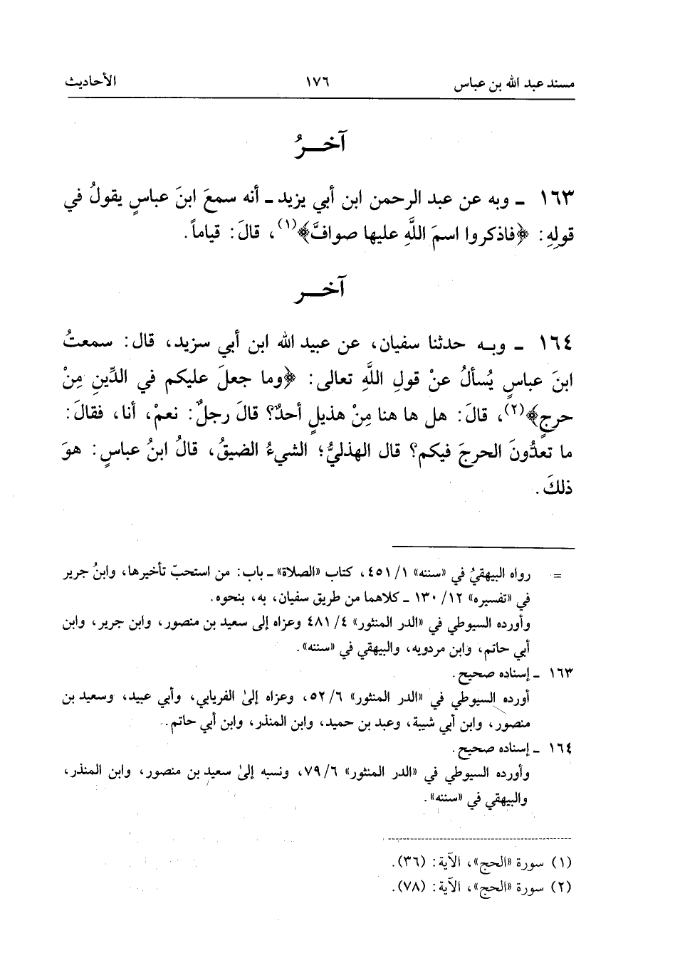 ١٦٣ - وَبِهِ عَنْ عَبْدِ الرَّحْمَنِ بْنِ أَبِي يَزِيدَ، أَنَّهُ سَمِعَ ابْنَ عَبَّاسٍ يَقُولُ فِي «قَوْلِهِ: {فَاذْكُرُوا اسْمَ اللهِ عَلَيْهَا صَوَافَّ}، قَالَ: قِيَامًا».