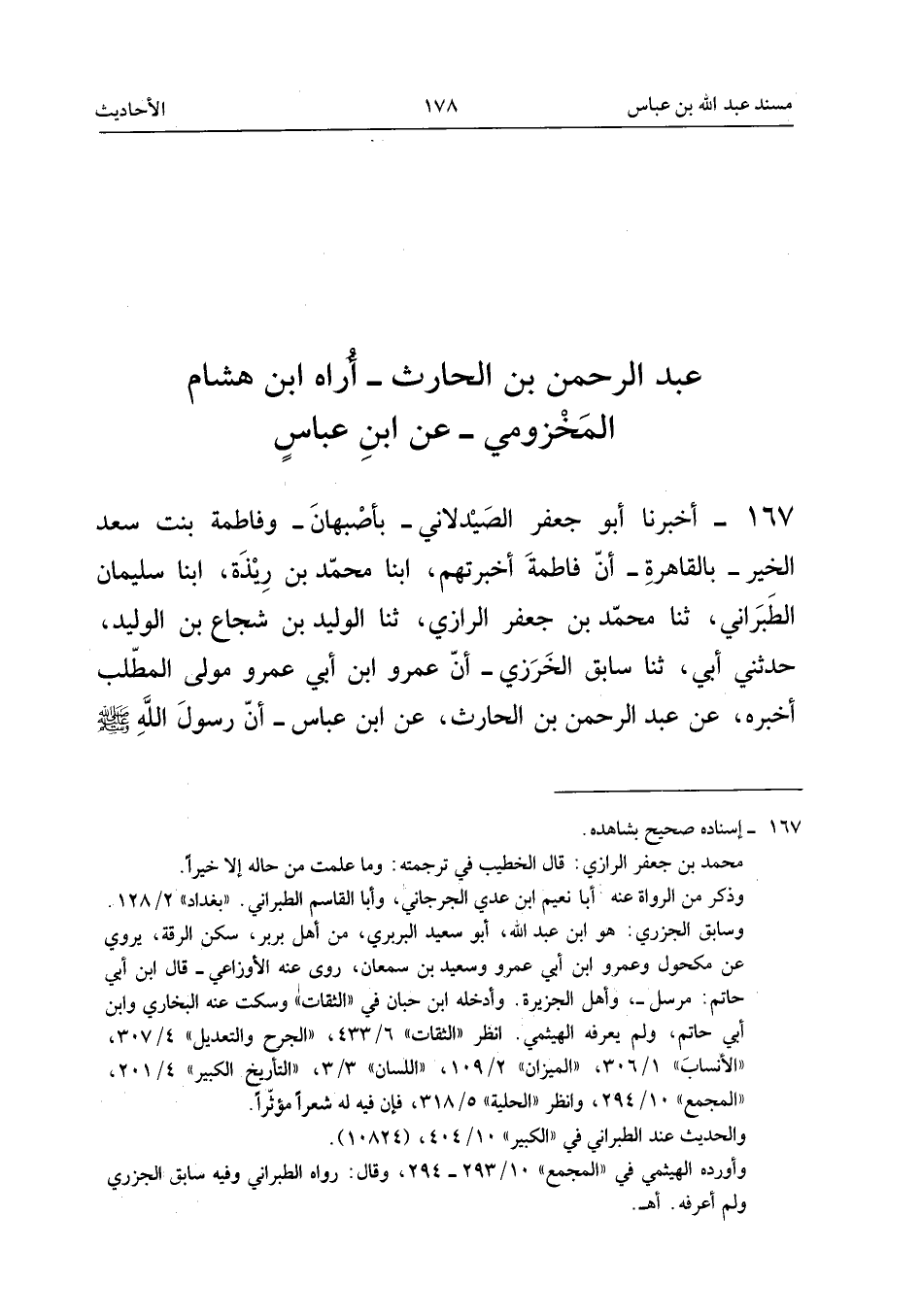 ١٦٧ - أَخْبَرَنَا أَبُو جَعْفَرٍ الصَّيْدَلَانِيُّ - بِأَصْبَهَانَ - وَفَاطِمَةُ بِنْتُ سَعْدِ الْخَيْرِ - بِالْقَاهِرَةِ - أَنَّ فَاطِمَةَ أَخْبَرَتْهُمْ، أَبْنَا مُحَمَّدُ بْنُ رِيذَةَ، أَبْنَا سُلَيْمَانُ الطَّبَرَانِيُّ، ثَنَا مُحَمَّدُ بْنُ جَعْفَرٍ الرَّازِيُّ، ثَنَا الْوَلِيدُ بْنُ شُجَاعِ بْنِ الْوَلِيدِ، حَدَّثَنِي أَبِي، ثَنَا سَابِقٌ الْخَرَزِيُّ - أَنَّ عَمْرَو بْنَ أَبِي عَمْرٍو مَوْلَى الْمُطَّلِبِ أَخْبَرَهُ، عَنْ عَبْدِ الرَّحْمَنِ بْنِ الْحَارِثِ، عَنِ ابْنِ عَبَّاسٍ، أَنَّ رَسُولَ اللهِ - صَلَّى اللهُ عَلَيْهِ وَسَلَّمَ -