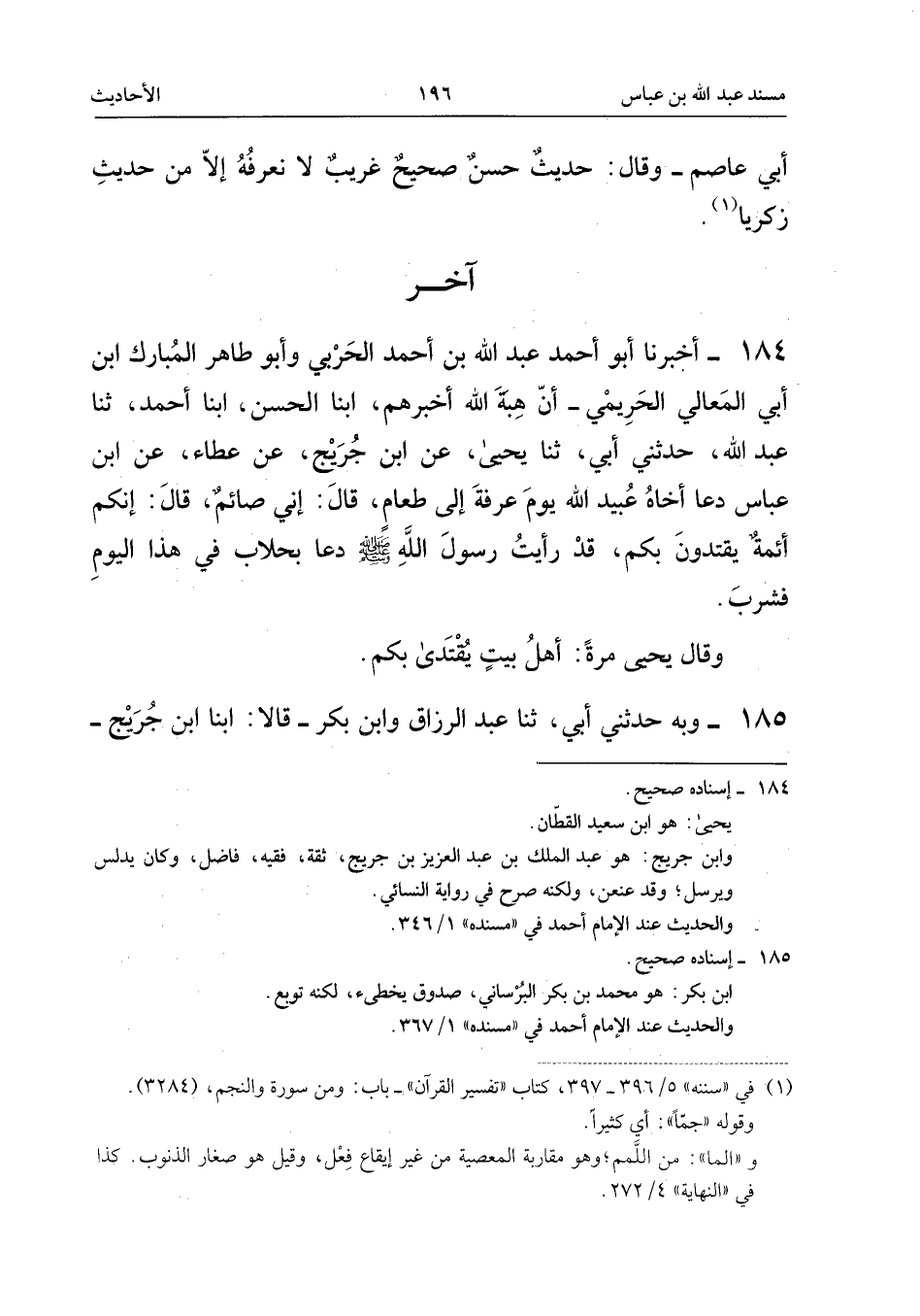 ١٨٤ - أَخْبَرَنَا أَبُو أَحْمَدَ عَبْدُ اللهِ بْنُ أَحْمَدَ الْحَرْبِيُّ (¬١) وَأَبُو طَاهِرٍ الْمُبَارَكُ ابْنُ أَبِي الْمَعَالِي الْحَرِيمِيُّ، أَنَّ هِبَةَ اللهِ أَخْبَرَهُمْ، أَبْنَا الْحَسَنُ، أَبْنَا أَحْمَدُ، ثَنَا عَبْدُ اللهِ، حَدَّثَنِي أَبِي، ثَنَا يَحْيَى، عَنِ ابْنِ جُرَيْجٍ، عَنْ عَطَاءٍ، عَنِ ابْنِ عَبَّاسٍ «دَعَا أَخَاهُ عُبَيْدَ اللهِ يَوْمَ عَرَفَةَ إِلَى طَعَامٍ، قَالَ: إِنِّي صَائِمٌ، قَالَ: إِنَّكُمْ أَئِمَّةٌ يَقْتَدُونَ بِكُمْ، قَدْ رَأَيْتُ رَسُولَ اللهِ - صَلَّى اللهُ عَلَيْهِ وَسَلَّمَ - دَعَا بِحِلَابٍ فِي هَذَا الْيَوْمِ فَشَرِبَ».