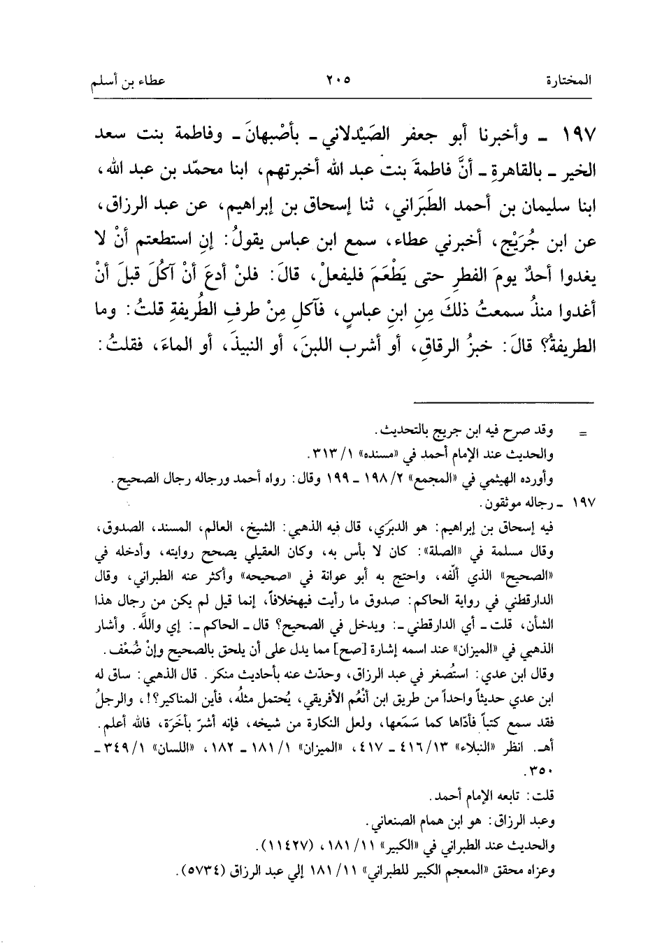 ١٩٧ - وَأَخْبَرَنَا أَبُو جَعْفَرٍ الصَّيْدَلَانِيُّ - بِأَصْبَهَانَ - وَفَاطِمَةُ بِنْتُ سَعْدِ الْخَيْرِ - بِالْقَاهِرَةِ - أَنَّ فَاطِمَةَ بِنْتَ عَبْدِ اللهِ أَخْبَرَتْهُمْ، أَبْنَا مُحَمَّدُ بْنُ عَبْدِ اللهِ، أَبْنَا سُلَيْمَانُ بْنُ أَحْمَدَ الطَّبَرَانِيُّ، ثَنَا إِسْحَاقُ بْنُ إِبْرَاهِيمَ، عَنْ عَبْدِ الرَّزَّاقِ، عَنِ ابْنِ جُرَيْجٍ، أَخْبَرَنِي عَطَاءٌ سَمِعَ ابْنَ عَبَّاسٍ يَقُولُ: «إِنِ اسْتَطَعْتُمْ أَنْ لَا يَغْدُوَ أَحَدٌ يَوْمَ الْفِطْرِ حَتَّى يَطْعَمَ فَلْيَفْعَلْ، قَالَ: فَلَنْ أَدَعَ أَنْ آكُلَ قَبْلَ أَنْ أَغْدُوَ مُنْذُ سَمِعْتُ ذَلِكَ مِنِ ابْنِ عَبَّاسٍ - فَآكُلَ مِنْ طَرَفِ الطَّرِيفَةِ، قُلْتُ: وَمَا الطَّرِيفَةُ؟ قَالَ: خُبْزُ الرُّقَاقِ، أَوْ أَشْرَبَ اللَّبَنَ، أَوِ النَّبِيذَ، أَوِ الْمَاءَ، فَقُلْتُ: