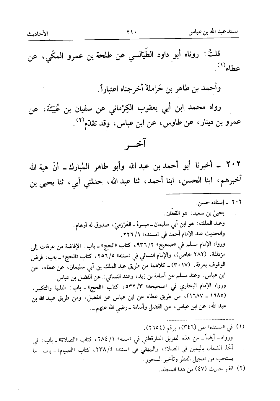 ٢٠٢ - أَخْبَرَنَا أَبُو أَحْمَدَ بْنُ عَبْدِ اللهِ وَأَبُو طَاهِرٍ الْمُبَارَكُ، أَنَّ هِبَةَ اللهِ أَخْبَرَهُمْ، أَبْنَا الْحَسَنُ، أَبْنَا أَحْمَدُ، ثَنَا عَبْدُ اللهِ، حَدَّثَنِي أَبِي، ثَنَا يَحْيَى بْنُ