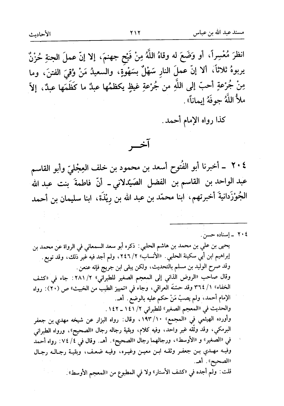 ٢٠٤ - أَخْبَرَنَا أَبُو الْفُتُوحِ أَسْعَدُ بْنُ مَحْمُودِ بْنِ خَلَفٍ الْعِجْلِيُّ وَأَبُو الْقَاسِمِ عَبْدُ الْوَاحِدِ بْنُ الْقَاسِمِ بْنِ الْفَضْلِ الصَّيْدَلَانِيُّ، أَنَّ فَاطِمَةَ بِنْتَ عَبْدِ اللهِ الْجُوزْدَانِيَّةَ أَخْبَرَتْهُمْ، أَبْنَا مُحَمَّدُ بْنُ عَبْدِ اللهِ بْنِ رِيذَةَ، أَبْنَا سُلَيْمَانُ بْنُ أَحْمَدَ