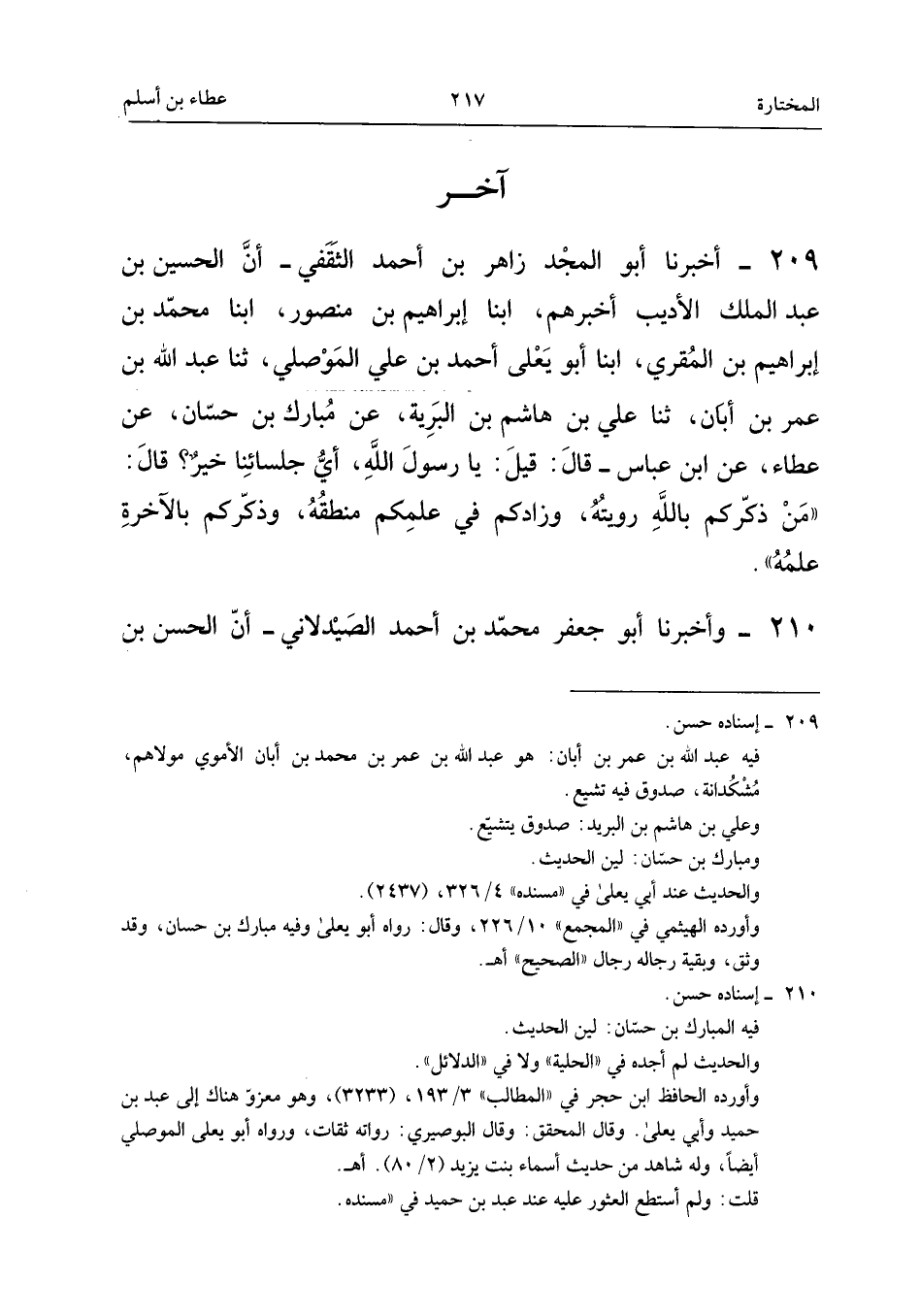 ٢٠٩ - أَخْبَرَنَا أَبُو الْمَجْدِ زَاهِرُ بْنُ أَحْمَدَ الثَّقَفِيُّ، أَنَّ الْحُسَيْنَ بْنَ عَبْدِ الْمَلِكِ الْأَدِيبَ أَخْبَرَهُمْ، أَبْنَا إِبْرَاهِيمُ بْنُ مَنْصُورٍ، أَبْنَا مُحَمَّدُ بْنُ إِبْرَاهِيمَ بْنِ الْمُقْرِي، أَبْنَا أَبُو يَعْلَى أَحْمَدُ بْنُ عَلِيٍّ الْمَوْصِلِيُّ، ثَنَا عَبْدُ اللهِ بْنُ عُمَرَ بْنِ أَبَانَ، ثَنَا عَلِيُّ بْنُ هَاشِمِ بْنِ الْبَرِيَّةِ، عَنْ مُبَارَكِ بْنِ حَسَّانَ، عَنْ عَطَاءٍ، عَنِ ابْنِ عَبَّاسٍ قَالَ: قِيلَ: «يَا رَسُولَ اللهِ، أَيُّ جُلَسَائِنَا خَيْرٌ؟ قَالَ: مَنْ ذَكَّرَكُمْ بِاللهِ رُؤْيَتُهُ، وَزَادَكُمْ فِي عِلْمِكُمْ مَنْطِقُهُ، وَذَكَّرَكُمْ بِالْآخِرَةِ عِلْمُهُ.»