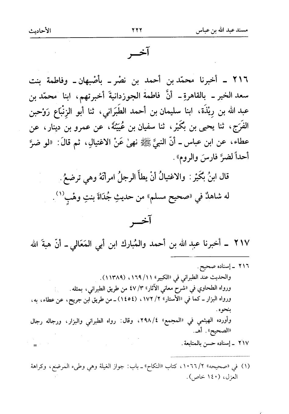٢١٦ - أَخْبَرَنَا مُحَمَّدُ بْنُ أَحْمَدَ بْنِ نَصْرٍ - بِأَصْبَهَانَ - وَفَاطِمَةُ بِنْتُ سَعْدِ الْخَيْرِ - بِالْقَاهِرَةِ - أَنَّ فَاطِمَةَ الْجُوزْدَانِيَّةَ أَخْبَرَتْهُمْ، أَبْنَا مُحَمَّدُ بْنُ عَبْدِ اللهِ بْنِ رِيذَةَ، أَبْنَا سُلَيْمَانُ بْنُ أَحْمَدَ الطَّبَرَانِيُّ، ثَنَا أَبُو الزِّنْبَاعِ رَوْحُ بْنُ الْفَرَجِ، ثَنَا يَحْيَى بْنُ بُكَيْرٍ، ثَنَا سُفْيَانُ بْنُ عُيَيْنَةَ، عَنْ عَمْرِو بْنِ دِينَارٍ، عَنْ عَطَاءٍ، عَنِ ابْنِ عَبَّاسٍ، «أَنَّ النَّبِيَّ - صَلَّى اللهُ عَلَيْهِ وَسَلَّمَ - نَهَى عَنِ الِاغْتِيَالِ، ثُمَّ قَالَ: لَوْ ضَرَّ أَحَدًا لَضَرَّ فَارِسَ وَالرُّومَ».