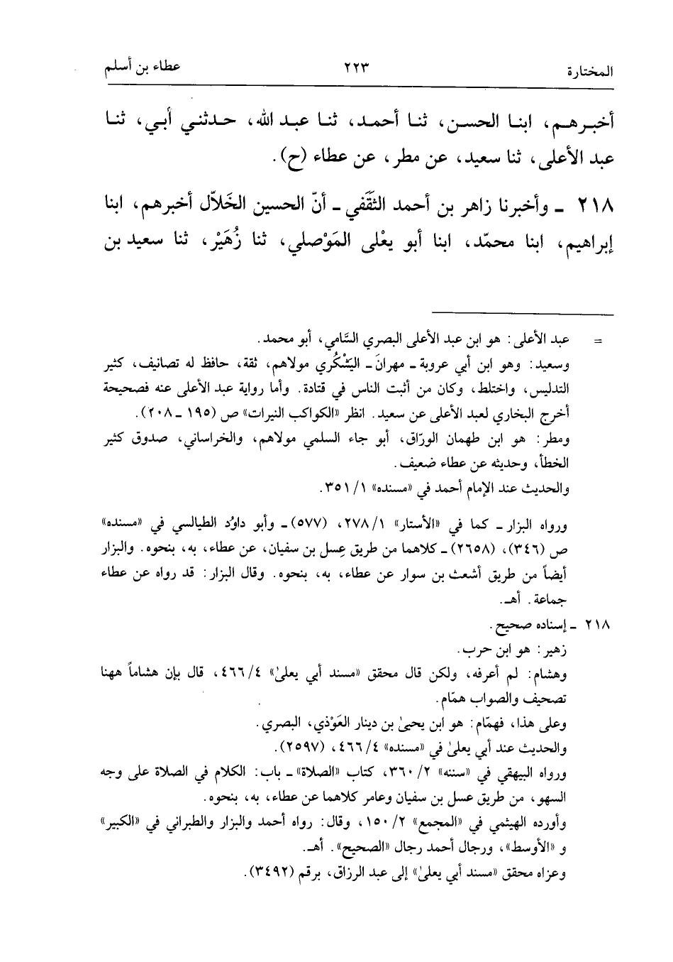 ٢١٨ - وَأَخْبَرَنَا زَاهِرُ بْنُ أَحْمَدَ الثَّقَفِيُّ، أَنَّ الْحُسَيْنَ الْخَلَّالَ أَخْبَرَهُمْ، أَبْنَا إِبْرَاهِيمُ، أَبْنَا مُحَمَّدٌ، أَبْنَا أَبُو يَعْلَى الْمَوْصِلِيُّ، ثَنَا زُهَيْرٌ، ثَنَا سَعِيدُ بْنُ