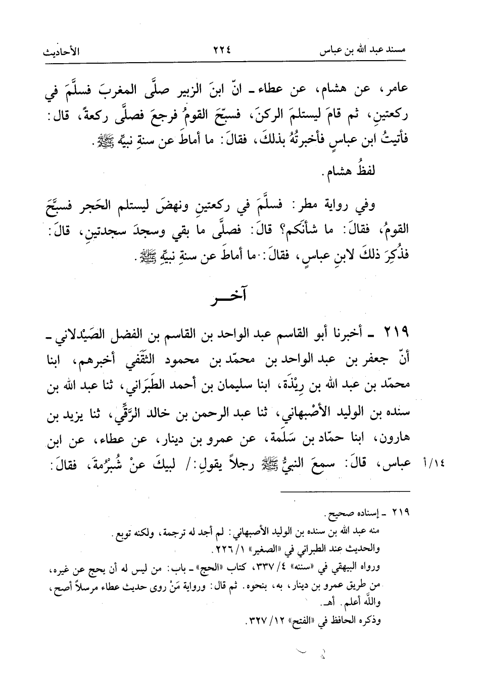 ٢١٩ - أَخْبَرَنَا أَبُو الْقَاسِمِ عَبْدُ الْوَاحِدِ بْنُ الْقَاسِمِ بْنِ الْفَضْلِ الصَّيْدَلَانِيُّ، أَنَّ جَعْفَرَ بْنَ عَبْدِ الْوَاحِدِ بْنِ مُحَمَّدِ بْنِ مَحْمُودٍ الثَّقَفِيَّ أَخْبَرَهُمْ، أَبْنَا مُحَمَّدُ بْنُ عَبْدِ اللهِ بْنِ رِيذَةَ، أَبْنَا سُلَيْمَانُ بْنُ أَحْمَدَ الطَّبَرَانِيُّ، ثَنَا عَبْدُ اللهِ بْنُ مَنْدَهْ بْنِ الْوَلِيدِ الْأَصْبَهَانِيُّ (¬١)، ثَنَا عَبْدُ الرَّحْمَنِ بْنُ خَالِدٍ الرَّقِّيُّ، ثَنَا يَزِيدُ بْنُ هَارُونَ، أَبْنَا حَمَّادُ بْنُ سَلَمَةَ، عَنْ عَمْرِو بْنِ دِينَارٍ، عَنْ عَطَاءٍ، عَنِ ابْنِ عَبَّاسٍ قَالَ: «سَمِعَ النَّبِيُّ - صَلَّى اللهُ عَلَيْهِ وَسَلَّمَ - رَجُلًا يَقُولُ: لَبَّيْكَ عَنْ شُبْرُمَةَ، فَقَالَ: