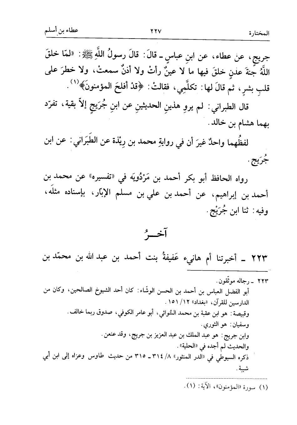 ٢٢٣ - أَخْبَرَتْنَا أُمُّ هَانِئٍ عَفِيفَةُ بِنْتُ أَحْمَدَ بْنِ عَبْدِ اللهِ بْنِ مُحَمَّدِ بْنِ