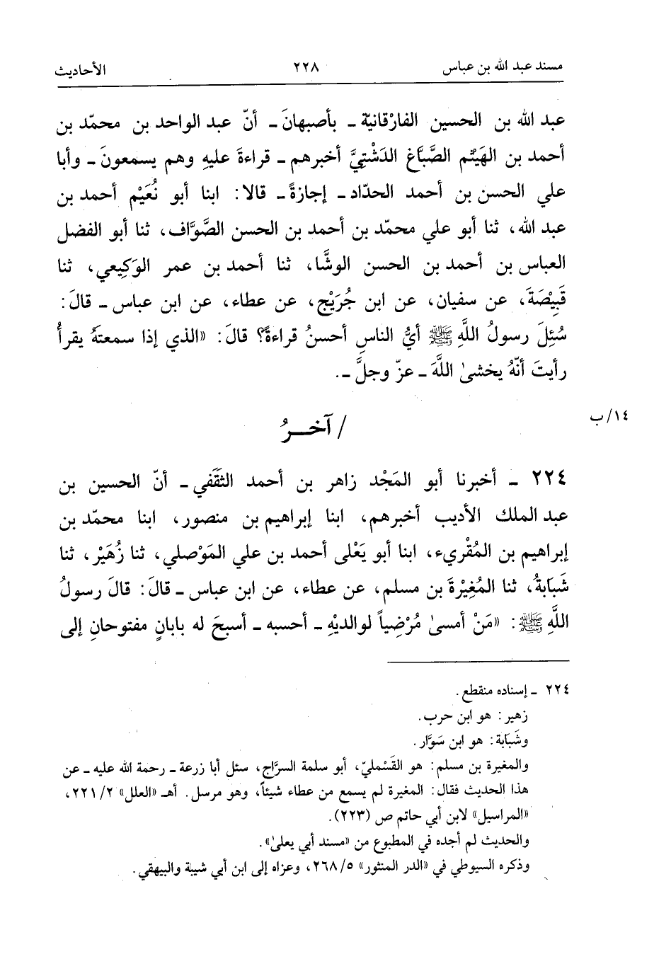 ٢٢٤ - أَخْبَرَنَا أَبُو الْمَجْدِ زَاهِرُ بْنُ أَحْمَدَ الثَّقَفِيُّ، أَنَّ الْحُسَيْنَ بْنَ عَبْدِ الْمَلِكِ الْأَدِيبَ أَخْبَرَهُمْ، أَبْنَا إِبْرَاهِيمُ بْنُ مَنْصُورٍ، أَبْنَا مُحَمَّدُ بْنُ إِبْرَاهِيمَ بْنِ الْمُقْرِئِ، أَبْنَا أَبُو يَعْلَى أَحْمَدُ بْنُ عَلِيٍّ الْمَوْصِلِيُّ، ثَنَا زُهَيْرٌ، ثَنَا شَبَابَةُ، ثَنَا الْمُغِيرَةُ بْنُ مُسْلِمٍ، عَنْ عَطَاءٍ، عَنِ ابْنِ عَبَّاسٍ قَالَ: قَالَ رَسُولُ اللهِ - صَلَّى اللهُ عَلَيْهِ وَسَلَّمَ -: «مَنْ أَصْبَحَ مُرْضِيًا لِوَالِدَيْهِ - أَحْسَبُهُ - أَصْبَحَ لَهُ بَابَانِ مَفْتُوحَانِ إِلَى